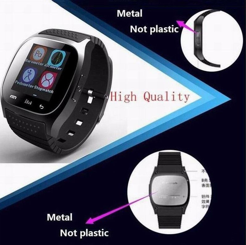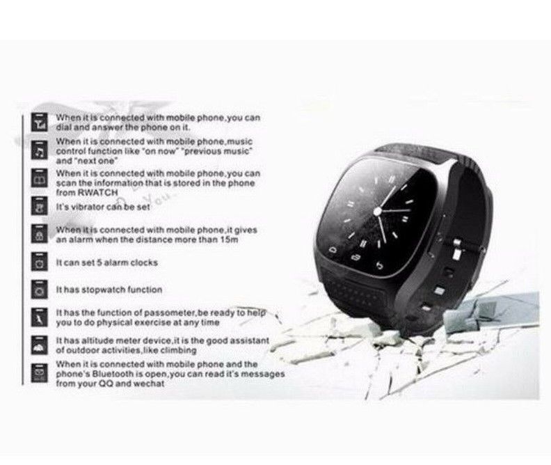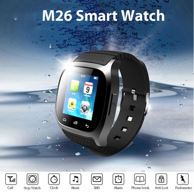 Benovel Bluetooth Wrist Smart Watch M26 Waterproof Smartwatch Call Music Pedometer Fitness Tracker For Android Smart Phone PK A1 DZ09 GT08 Note:Russian friends, please leaver us your full name.This is very important.Thank you!(Due to the Russian postal policy adjustment, buyers need to fill in the full name to make sure a normal receive for your items.) Features: Sync music Sync phone clock to watch Sync 1000 phonebook, 200 call log, 10 SMS Sync message. With pushing message, such as MMS, QQ, Wechat, news title, calendar events, etc Sync such as LINE, Instagram Facebook (message), Gmail, CNN App, ZAKE, etc Remote android phone camera operation Can connect to all BT phone and tablet Android smart watch installed APP can support information push,IOS can not install APP And IOS / Nokia / Blackberry / Feature Phone BT connect, support sync 2 RWATCH BT can connect to achieve anti-theft alarm and tracker Specifications: People : Unisex table Style : Fashion&Casual Watches categories : Digital watch Shape of the dial : Rectangle Movement type : Digital watch Display type : Numbers Case material : Rubber/Silicon/Silica Gel Band material : Rubber Clasp type : Pin buckle Special features : Thermometer, Call Answer, Week, Altimeter, SMS Reminding, Pedometer, Phone book, Stopwatch, Music Player, Date, Alarm clock, Anti-lost alert, Dial, Stopwatch, Waterproof :Life waterproof,please don't put this watch in water! Note: 1. M26 no APK for iPhone, so four functions can't sync with iphone(1. Music Player, 2. Messaging, 3. Notifier, 4. Remote Camera), but all other functions can use normally because no need to use app. 2 . Android Phone can support all function in the description. Package Include: 1 x Watch 1 x USB Charging Cable 1 x User Manual