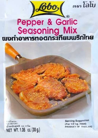 I love everything from Lobo brand, the products are so tasty and capture authentic Thai flavors perfectly with easy-to-prepare methods. This Pepper & Garlic Seasoning Mix is one of our favorites. Simply add a bit of water and you have a wonderful marinade to use with any meat. We like marinating strips of pork or beef on bamboo skewers, marinading for 30 minutes and cooking. You can also add a bit of honey for a more American flavor. A convenient envelope packet, enough to make one large serving. See picture below, we marinaded pork and barbecued it along with sliced potato and carrot which we'd boiled before. Ingredients: Sugar, salt, soy sauce powder, spices, soybean oil, silicon dioxide as anti-caking agent (no msg, artificial color or preservatives). Product of Thailand.