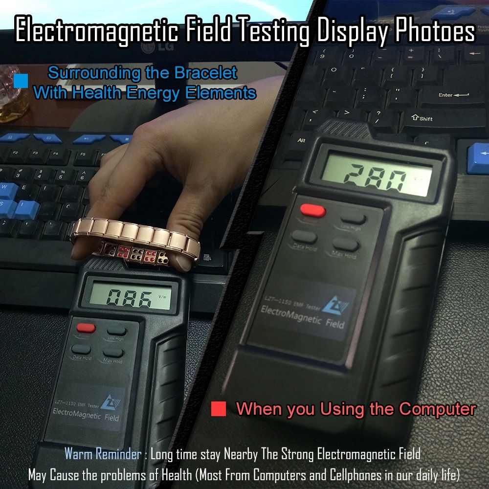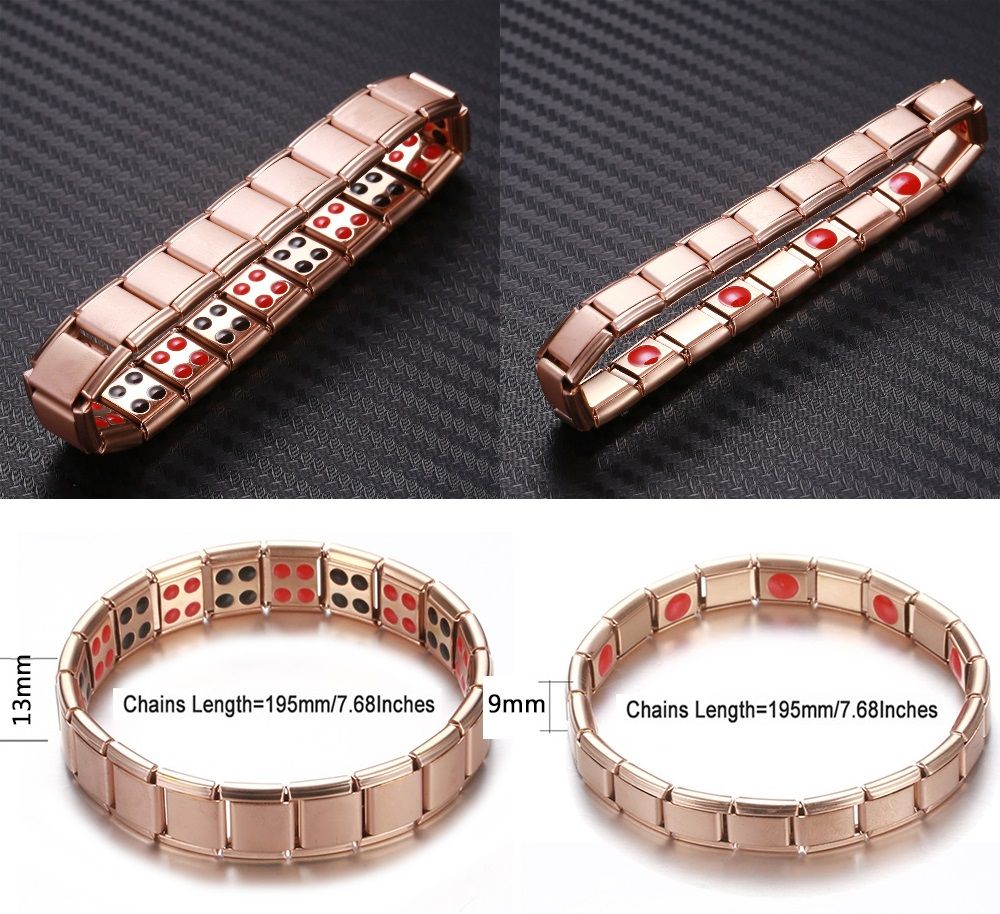 Description Free Shipping Healthy Germanium Magnetic therapy Bracelet for men & women Description: Type: Rose Gold Germanium Magnetic Men/women Bracelet Material: Stainless Steel Color: Gold, Copper Color Length: About 18-25cm(Adjustable) Width: About: 9-13 mm Weight: About 30g Features: 1. Anti-fatigue, anti-radiation 2. Enhanced energy 3. Health care Package Includes: 1xPower Bracelet Notice: 1.Due to the difference between different monitors, the picture may not reflect the actual color of the item. Please consider this before the purchase. 2.Please allow slight deviation for the measurement data. Who should wear This product: * If you have to use a computer or a cell phone for a long period of time * If you have to keep focused on your work for a long period of time * If your job requires you to stand or do laborious work for a long time and if you are a person who always has cold hands and cold feet * If you have problems such as tense nerves, poor blood circulation, or stiffness and shoulder and neck pains. * If you are weakly resistant to illnesses and catch colds easily. * If you have a stressful life style and want to relax and regain your energy. * If you have an irregular life style and are often sleepless. * If you are fond of sports and want to develop your sport fitness. Thermography Tests As can be seen from the thermography tests below - Vital-ion negative ion necklaces and bracelets significantly enhance the wearer's circulation. This increase in circulation may assist with the body’s ability to recover from injury and may assist those who suffer from poor circulation. Of course, anyone wearing a Vital-ion necklace or bracelet may also enjoy the benefits from an improved circulation and a speedier recovery. Benefits * Reduce muscle tension and increase flexibility - Injury prevention * Reduce fatigue and tension and thus enhance the ability to perform at optimum level * Improve blood circulation