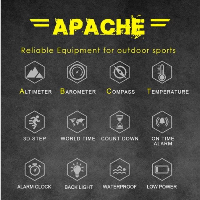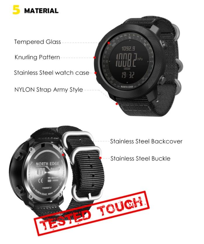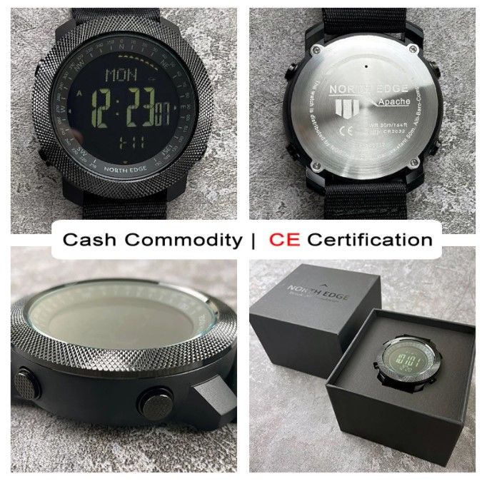 Product Information: Brand Name: NORTH EDGE Item Type: Digital Wristwatches Style: Sport Feature: Complete calendar, shock resistant, temperature measurement, stop watch, led display, auto date, pressure measurement, week display, altimeter, water resistant, compass, chronograph, back light, multiple time zone, swim,alarm, luminous, repeater Case Material: Plastic Band Material Type: Rubber Dial Diameter: about 50mm Case Shape: Round Dial Window Material Type: Glass Boxes & Cases Material: Paper Movement: Smart,digital Clasp Type: Buckle Band Width: about 24mm/0.95in Band Length: about 25cm/9.84in Model Number: APACHE Water Resistance Depth: 5Bar Case Thickness: about 14mm/0.55 Item: North edge new digital watch smart Sport Type: Clock men digital smart Water Resistance: 50M digital watch waterproof Dial Display: Relogio masculino digital Item Type: Men watch sport military Function: Running, climbing, hiking, temperature measurement,multiple time zone Function2: Hiking, fishing, climbing, mountaineering, pressure measurement, altimet Feature: Military watches men army Feature2: LED digital military army watchesfeature3:men watch digital Feature3: Men watch digital Functions: 1. Altimeter (altitude trend chart and climb rate) 2. Barometer ( air pressure trend chart) 3. Compass 4. Thermometer 5. Weather Forecast 6. Pedometer, step counter, calorie, distance record 7. Time functions: hour, minute, second, year(2000-2099), month, date, weekday, 8. Alarm clock (2 sets alarm clock, ) 9. Countdown timer (99:59:59~0) 10. Stopwatch (0~:59:59), 12. Worldtime functions (daylight saving time switch automatically) 13. Corporates digital compass, altimeter, barometer, Thermometer, air pressure trend and altitude trend and altitude trend 14. Button tone on or off 15. Battery life remind 16. EL Backlight Package: 1*watch