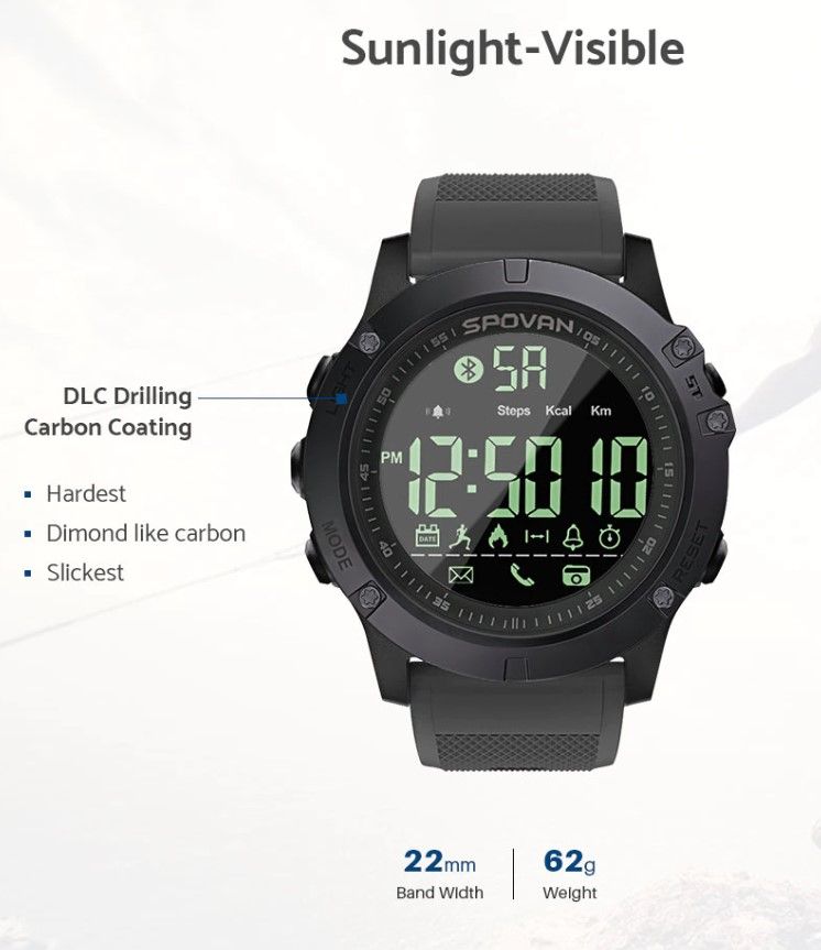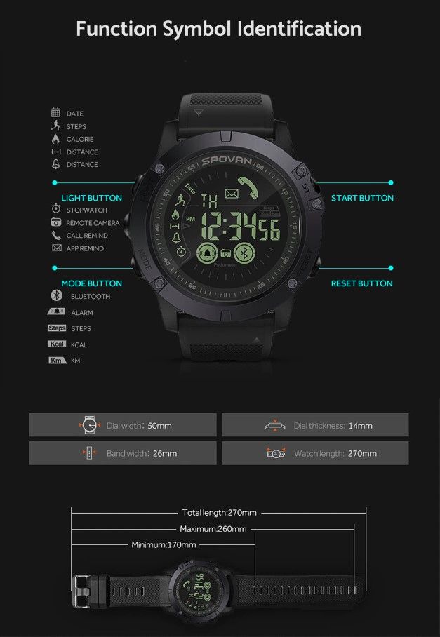 Rugged smartwatch for iOS/Android Key features • 50-meter waterproof • 12 months standby time • 1.24inch FSTN / Full View(Sunlight-Visible) • Stores movement data • For iOS & Android • Functions: Today's date, pedometer, burned calories, walking calories Alarm setting, stopwatch function, remote camera, Incoming call reminder, notifications (SMS, Facebook, Twitter, Skype, WhatApp, WeChat) • Languages: Simplified Chinese, English, French, Italian, German, Russian, Spanish, Portuguese, Japanese, Arabic Reminders: 1) Do not wear it when taking a shower or go swimming.. 2) Do not press any buttons under water. Dust-resistant & 5 ATM waterpoof Backed by an international standard rating of IP67, VIBE 3 wrist watch has waterproof performance high up to 50-meter/164 ft, Hence, no water, dust, or dirt will soak into the smartwatch in daily life or on ourdoor trips. For travelers who often encounter heavy rain, mud, and rivers, the impervious VIBE 3 would definitely be your best assistant. Features: 1. 【Multi Smart Function】: Pedometer, distance tracker, calories tracker, incoming call and SMS reminder (facebook,twitter,whatsapp), alarm, stopwatch and time display:seconds, minute, hour, week and date. 【Ultra-long battery life】12-18 months battery life. No need to charge everyday. The watch is with Maxell CR battery. CR battery is easily to buy anywhere to replace. 2. 【Remote Camera Function】: Pair the smart watch bluetooth to your smartphone and then press the watch's button to control your smartphone take photos. 3. 【50M Waterproof】: Enjoy swimming, washing hands and walking in rain with the smart sports watch. (Note: warm or hot water is not allowed). 4.【TURN ON Watch】: The watch is 【POWER OFF】to save battery. Please press BOTH Button B and Button C for 3 seconds to 【TURN ON】 the watch. 5.【Note】It needs you to Re-pair the watch with phone after long lost connection between watch and phone Specifications: Bluetooth Version: Bluetooth 4.0 Waterproof: IP67 Bluetooth calling: Phone call reminder Message: Message reminder Health tracker: Pedometer Remote control: Remote Camera Notification type: Facebook, Skype, Twitter and WhatsApp Groups of Alarm: 3 Alert types: Ring Stopwatch: Supported Screen: LCD Screen size: 1.12 inch Type of battery: 1 x CR2450 battery ( included ) Battery Capacity: 210mAh Standby time: 12 months Shape of the dial: Round Case material: TPU Band material: TPU Compatible OS: Android, IOS Compatibility: Android 4.3 / iOS 7.0 and above systems Incomparable durability 26 mm sports straps Anti-allergic, anti-corrosive, stretch-proof Vibe 3 can withstand severe tests and deal with all kinds of adventures and challenges at any time Track it all to make life seamless: All-day activity record Better calorie burn tracking Walking distance Information reminder Alarm alert Remote camera Enrich, relive, and share 1) Movement data can be saved on watch for 15 days 2) It can be saved on cloud server permanently after uploading 3) It could be accessed by phone or tablet APP at any time Share your experience instantly to your social media networks: 1) The APP and background server support global network 2) You could share with friends worldwide and check ranking Smart mobile connection 1) Data transmission: Wireless/sync 2) Connectivity (between devices): Bluetooth Smart 3) Smartphone compatibility: Android, iOS 4) Compatible version: iOS 7.0 and above, Android 4.3 and above 5) APP Languages: Simplified Chinese, English, French, Italian, German, Russian, Spanish, Portuguese, Japanese, Arabic Package included: 1* sports smart watch. 1* user manual.