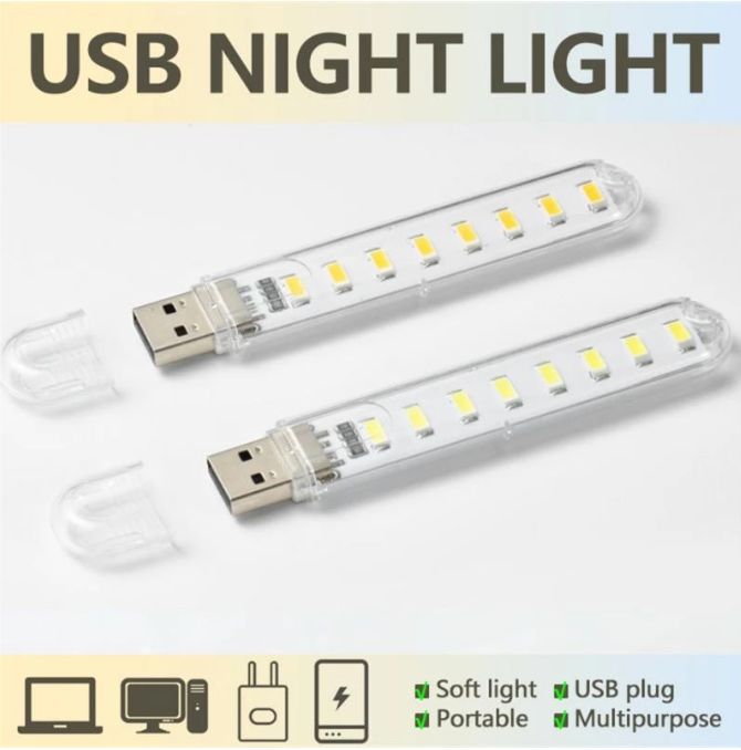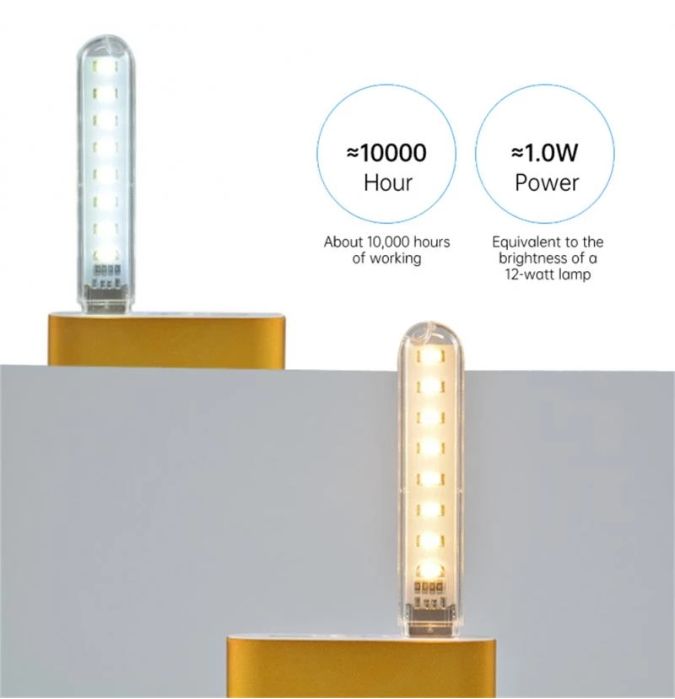 Type: 8 LED USB Lamp Material: Plastic Light Color: White, Warm Size:101mm*18mm*9mm package:1pcs Application: Living Room, Bedroom, Kid's Room, Office,Home Study, etc. Rated Voltage: DC 5V (Universal 5V USB Power Supply) Powered by: Laptop,Desktop,Power Bank,Socket with USB,etc