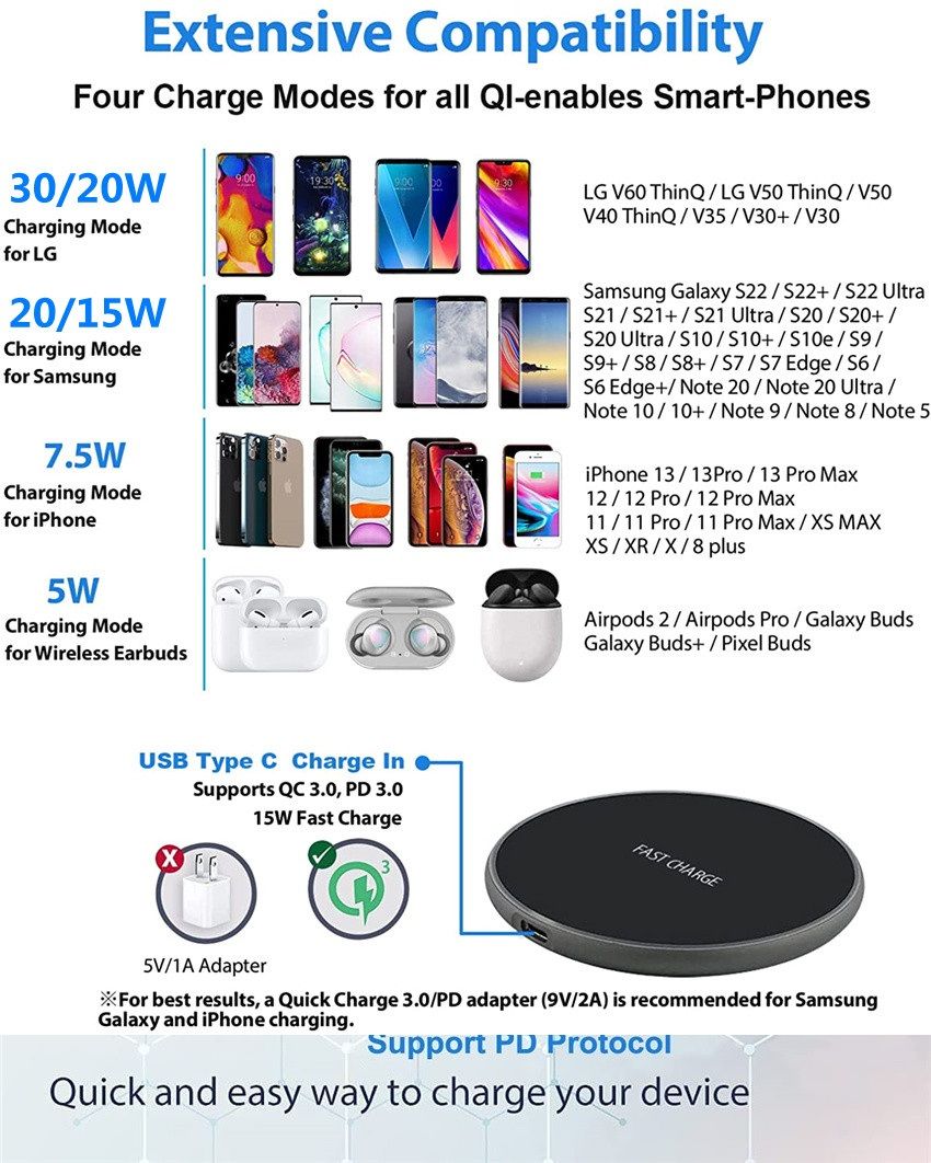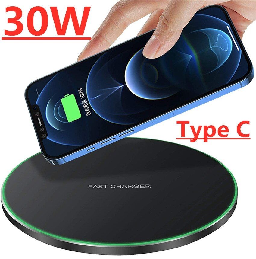 30W Wireless Charger Pad For iPhone 13 12 11 X Pro Xs Max Mini Induction Qi Fast Wireless Charging For Samsung Xiaomi Huawei LG Extensive Compatibility: 30W Fast wireless charging pads compatible with Huawei Mate40 Pro+5G/Mate40 RS,20W/15W Fast wireless charging mats compatible with iPhone 13 series,iPhone 12 series,Samsung S21/S20/Note 20,LG/Sony; 10W Fast wireless charging pad for Samsung Galaxy 10/9/8/Note 10/9/8/,Nokia/Google; 7.5W wireless Charging docks For iPhone 11series/X/XS/8/SE ; 5W standard wireless charger for Airpods 3/2/Pro, Samsung Galaxy Buds and ALL Qi-enable Devices. Easy Wireless Charging and Case friendly: The fast wireless charger allows you to charge your device at a higher charging speed which up to 1.8X faster than standard wireless charger.Don't fumble with your phone case. Inductive charging directly through protective cases up to 6mm/0.23inch thick (not including cases with magnetic or metal attachments). Slim and Cool Design: Lightweight,sleek,compact design with non-slip rubber. This wireless charging pad is just 6mm/0.23inch super slim and takes up very little space make it easier to put it in pockets, a high speed wireless power charging pad can be easily carried during travel or business,This charger feels solid and looks great no matter using it in the office or at home. Smart indicator : When the power is on, the indicator light will be turn on green light for 20 seconds automatically turn off If the charging device is not detected in 20 seconds,In standby,When you put mobile phone or earbuds on to charging. The weak blue light flashes slowly until it is fully charged. The weak light will not affect your sleep. Specifications: Color: Black/White/Red/Gold Output : 5W/7.5W/10W/15W/20W/30W(30W Max will be charging faster than others) Charge efficiency: >75% Charging frequency: 110 - 205 KHz Package Included: 1*Fast Wireless Charger Pad 1*1m Type C USB Cable(Without included if you do not selected ) Check out our website udonshopping.com for more info