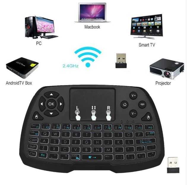 This is a 2.4GHz wireless mini QWERTY keyboard and TouchPad combo, with USB interface receiver. Plug and play, simple and smooth. The mini keyboard ensures convenient typing, and you can control your devices on your couch. Features: Multifunctional combo: Wireless mini keyboard and touchpad mouse, 2 in 1 smart combo. Ergonomic design, compact and light-weight. 2.4GHz Wireless Connection: With included USB interface adapter, no driver needed, plug and play. 2.4GHz wireless connection, enjoy up to 10 meters wireless control. High Sensitive Touchpad: Easy to operate a left mouse, right mouse, and rolling screen. Supports touchpad DPI adjustable functions, better matching different sizes of screen. 69 Keys Keyboard: The mini keyboard ensures convenient typing with 69 keys, and you can control your devices on your couch. Also features auto sleep and auto wake mode. Strong Compatibility: Compatible with PC, Notebook, Smart TV, Android TV Box, etc. The Ergonomically handheld design is easy to carry and operate. Note 1: USB Dongle is placed at the back of the keyboard. Note 2: AAA dry batteries are not included, you need to buy two yourself. Specifications: Frequency range: 2.403GHz-2.480GHz Operating distance: Up to 10 meters / 30ft Power Supply: 2 * AAA battery (not included) Operating voltage: 3.3V Operating current: