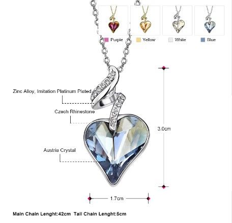 Specifications: • Brand name: Neoglory Jewelry • Item type: Necklace • Fine or fashion: Fashion • Necklace type: Pendant necklace • Gender: Women • Chain type: Link chain • Clasp type: Lobster • Material: Austrian crystal, rhinestone • Shape/pattern: Heart • Style: Trendy • Compatibility: Fully compatible • Metal type: Zinc alloy • Function: Fashion • Main stone: Austrian crystal • Plated color: Gold, silver • Customizable: Yes • Shipping: Free shipping • Length: 42 + 5 cm • Stone color: Blue, yellow, white, purple • Occasions: Party, prom, anniversary, shopping, office • Type: Heart crystal chain necklaces