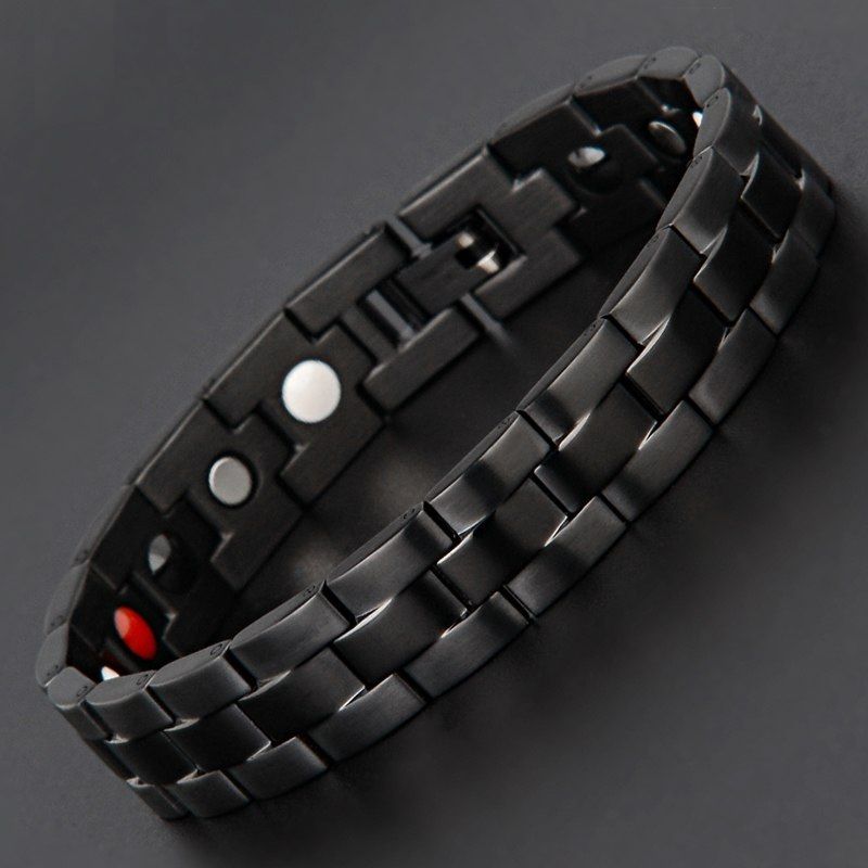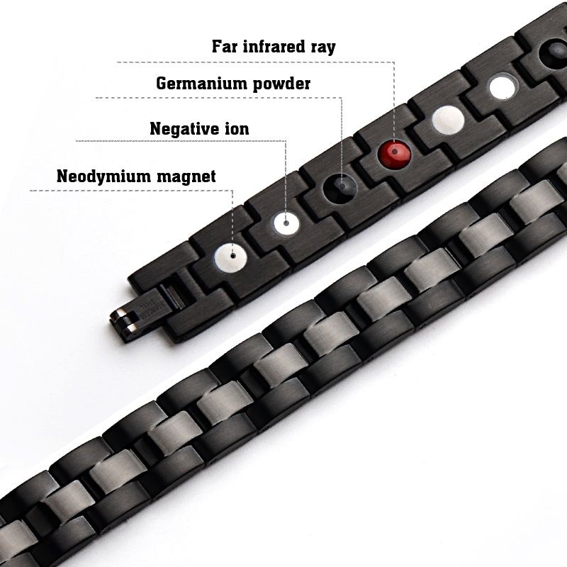 Black Bio Elements Health Care Bracelet made from Stainless steel With Magnet Negative ion Germanium Far infrared Features : - Magnet can improve the body's immune function, mainly used to relief dizziness, palpitation, insomnia, irritability and dreaminess. -Far infrared ray can promote the growth and health of living cells. It can be accelerate blood circulation, adjust blood pressure, improve arthralgia, adjust autonomic nerve, promote metabolism. -Negative ions can improves sleep quality, increase the oxygen content, and is beneficial to oxygen transmission, absorption, and utilization. -Germanium powder can shields the electromagnetic radiation in our daily life. Adjusts blood pressure, reduce fatigue. Specifications : Material : 316L Stainless Steel Length : 21.5CM Width : 1.27CM Colors: Black Health Energy Elements: Magnet/Far Infrared Ray/Negatives Ions/Germanium Powder Fuctions: Antifatigue&Radiation Protection And So On Gender: Women/Men/Unisex/Lovers Occasions: Birthday gift/anniversary/wedding/Party Note: Please allow manual measurement error of 0.1-0.3 cm
