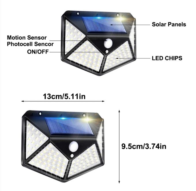 Features: 1.Well quality: Use by well quality ABS material, it is durable to use outdoor and long term use. 2.PIR motion sensor: The sensitive PIR sensor light can detect people movement from 3 to 5m. It will automatically control the light on and off. 3.IP65 water resistant: The Solar Light is made of ABS and IP65 Water-resistant material. It can work in different kinds of weathers like rain snow ang fog. 4.Long working hours: If fully recharges the battery more than 8 hours with direct sunshine, it will keep lighting more than 8 hours 5.Powered by solar energy: The solar panel is at the top of the lamp. It will automatically store electricity during the day. Please install the product at the direct sunshine place. This Outdoor Solar Light is wireless. You can install it on the wall 6.Super bright: Much brighter than other lamps. Each solar-powered path light has superb-bright eye-protective, flicker-free and no-radiation white LED lights for illumination. It is easy to install on the tree glass metal. Specifications Input Voltage: 5.5V Total power:20W Bulb type:LED Light source: Solar Light LED quantity: 100pcs LEDs Light color: Cold White Power source: 1* 3.7V 1200mAH lithium battery Charging hours: 8hrs Working hours: more than 8hrs Control modes: Light/ PIR High light delay: 20-25s Sensor angle:120° Sensor distance:3-5m Protecting grade: IP65 Material: ABS Item color: Black Lamp size: 125*88*47mm/4.9*3.5*1.9in (Length * Width * Height) Item weight: 154g Package size: 130*100*55mm/5.1*3.9*2.2in(Length * Width * Height) Package weight: 170g Note: Please make sure the solar light been installed within 3 meters height and make sure the solar panel can absorb sunlight. Before use please turn on the switch. Package: 1/2 *LED Solar Light 1/2 * Expansion Pipe 1/2 * Screw 1/2 * User Manual