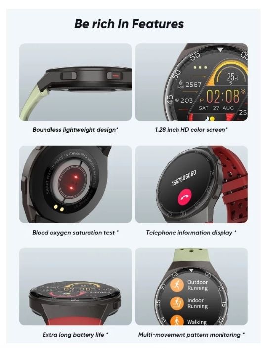 Product parameter Screen: 1.28 inch full fit HD Touch panel: full screen touch Resolution: 240*240IPS HD screen Battery: 220Mah Waterproof: IP68 APP name:Glory Fit Hardware parameters Bluetooth version: BT5.0 System version: Android 4.4 or above or IOS 8.0 or above Software function Pedometer, multiple exercise modes, heart rate, blood oxygen, blood pressure, sleep monitoring, sedentary reminder, call reminder, message push, drink reminder, stopwatch, music control, camera control, anti-lost, alarm clock, weather, APP dial push , Custom watch face language Watch support languages: Russian, Indonesian, German, Italian, Czech, Japanese, French, Polish, Simplified Chinese, Traditional Chinese, English, Portuguese, Spanish, Arabic, Korean, Dutch, Hindi APP Supported languages:Russian, Indonesian, German, Italian, Czech, Japanese, French, Polish, Simplified Chinese, Traditional Chinese, English, Portuguese, Spanish, Arabic, Korean In Package: Host, charger, wrist strap, manual After receiving the watch, please charge it first. Due to long-term logistics, the watch battery is low. Before use, please scan the QR code on the manual to download the APP, and connect the watch through the APP.
