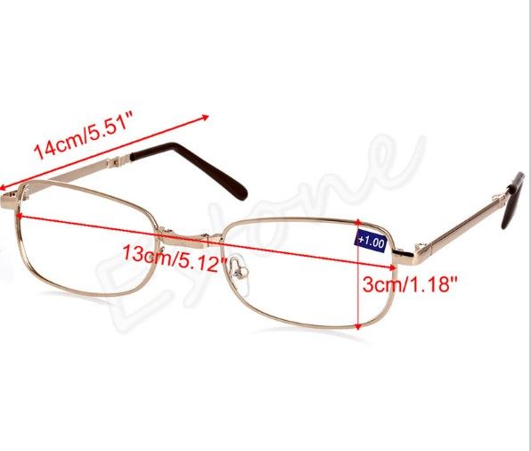 Frame Material: Metal Lens Material: Resin Case Material: Leather Color: Golden/Silver Gender: Unisex Can be folded The unique design details, fashion and generous, with the following excellent performance and features. The soft pattern of the tail helps relieve discomfort during take off glasses, even oppression will not easily deformed, so wear more comfortable. Strength: +1.00, +1.50, +2.00, +2.50, +3.00, +3.50, +4.00 Picture Frame Size:13cm/5.12'' in length; 3cm/1.18'' in width (approx.) Glasses Leg: 14cm/5.51'' in length (approx.) Case Size: 4cm/1.57'' in length; 3cm/1.18'' in width; 7.5cm/2.95'' in height (approx.) Quantity: 1Set Note: Due to the difference between different monitors, the picture may not reflect the actual color of the item. Thank you! ​ Package include: 1Pc x Reading Glasses 1Pc x Case