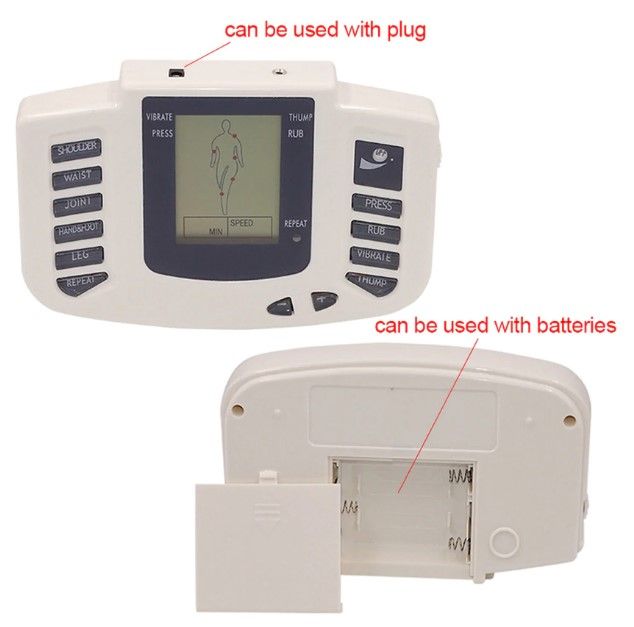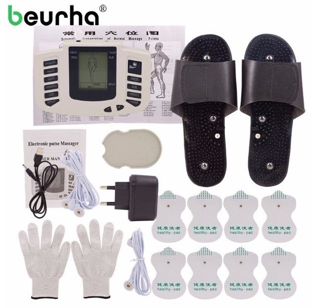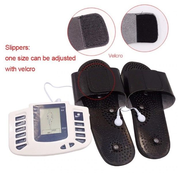Notice: Please kindly follow Step 1 & Step 2 1. Stick the electrodes directly onto the skin to be massaged(Treatment can't be effected unless both of the two electrodes or four electrodes onto the body surface). 2. Put on the power. 3. If you need full video, send us your email address and we will send it to you by email, thank you! Package Included: 1) Massager * 1 (RU Button=Russian Keyboard / EN Button=English Keyboard) 2) Electrode pads * 16 (for more pads, please click this link: http://www.aliexpress.com/item/20-pcs-White-Electrode-Pads-For-Electric-Tens-Acupuncture-Digital-Therapy-Machine-for-Slimming-Electric-Body/32815327299.html ) 3) USB Cable * 1 4) Power Adapter (US, EU, UK, AU) * 1 (The adapter will be sent according to your country, if you have any requirement, please remark it in order or leave us a messager, we will handle it for you, thank you! ) 5) English User Manual * 2 (We also have e-manual, which can be sent by E-mail, Russian manual is available, leave us your email address when you place the order) 6) Connecting cable * 2 (2-way and 4-way) 7) Slippers Features: 1 Digital display for treatment guide Uses the infrared physical therapy electrodes Improves your body circulation, relieves your pain and promotes your metabolism Suitable for waist, shoulders, legs, foot massage and physical therapy do the physical therapy for the four parts of your body at the same time 4 therapeutic modes: vibrate thump, Shiatsu, Massage, Pat and Scrape therapy 8 Massage modes and 10 massage power levels Comes with two pieces of massage electrodes, a charger, a electrode wire, and a pair of shoes Power Supply: 3* AA Batteries(Not included) or USB Cable Size: 15*10*4cm (The size of this pulse slipper is adjustable, it can suitable for most of size of feet. Thank you.)