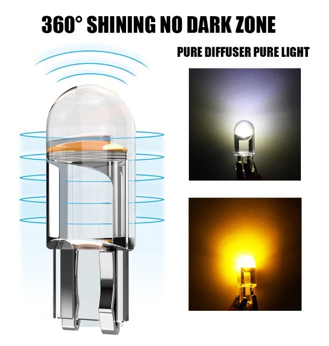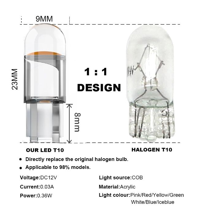 LED chips: COB Type: T10, W5W, 168, and 194 Voltage: DC 12 Power: About 1W Working current:0.4 Lumens: 400 lumens Colors: White/Crystal blue/Yellow/Red/Pink/Blue/Green Common uses: License plate lights, cabin lights, dome lights, map lights, clearance lights, reverse lights, brake lights, fog lights, turn signal lights, etc. Suitable for motorcycles, car,auto, vehicle,motos, ATVs, UTVs,cars, trucks,Scooter Lighting Easy to install,plug&play Package includes: 10x T10 / W5W LED bulbs