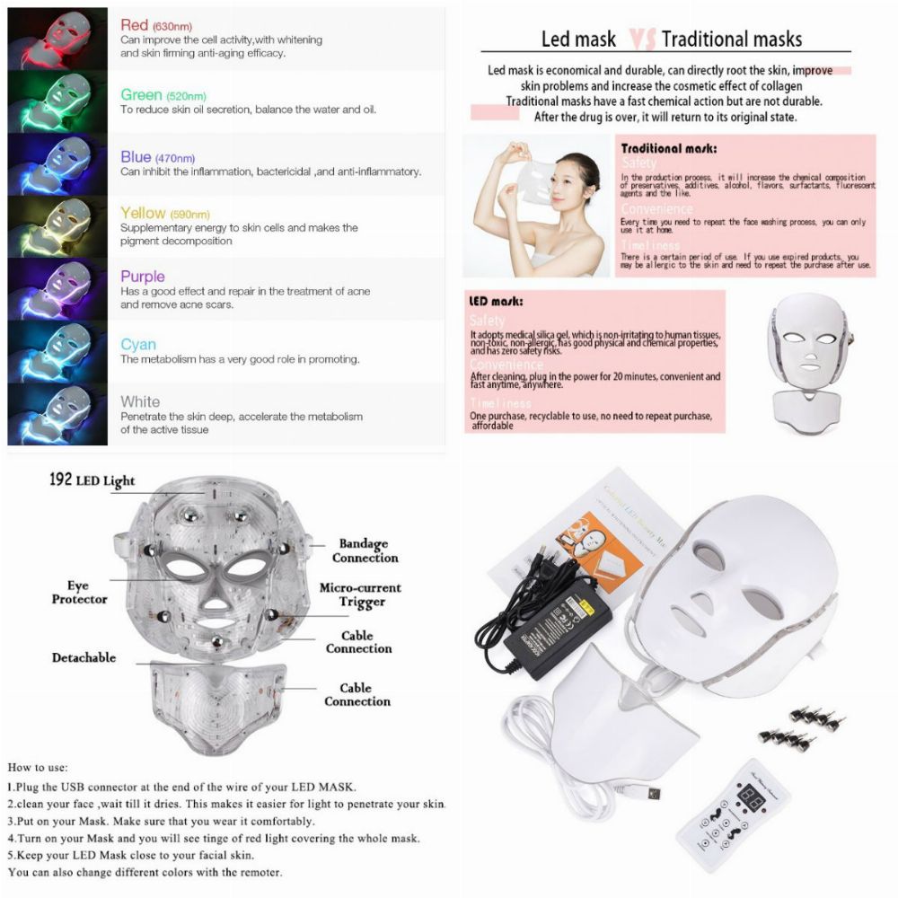 7 Colors Light LED Facial Mask With Neck Skin Rejuvenation Face Care Treatment Beauty Anti Acne Therapy Whitening Instrument Now you can experience all the benefits LED light therapy has to offer, right in the comfort of your home! The DermaLight Professional LED Light Therapy Mask is one of the most effective & latest breakthroughs in skin care, treating a wide variety of skin ailments. There are seven different color LEDs built into the mask, each color treating different skin conditions from wrinkles, acne, pigmentation, and more. The LED light therapy technology used in the DermaLight Mask is the same exact therapeutic LED technology used by NASA and is backed by more than a decades worth of scientific research. Spas everywhere have started using LED light therapy in recent years due to it's extreme effectiveness and the results have been amazing! Suitable for the crowd: Irregular diet, staying up late, sitting in front of a computer, often using a mobile phone For the skin: spots, freckles, acne, dull, dark yellow, large pores, rough, loose skin Advantage: 1. The number of LED lights is another important reference standard for the function of LED beauty instruments. Because more LED lights will produce faster and deeper beauty effects, let you achieve 10 or even 20 times the effect of other products. 2. LED beauty mask effect: whitening skin, shrink pores, increase collagen, increase skin luster and elasticity, anti-aging, firm skin, improve dark circles, eye bags, fine lines, dilute dark spots and dry spots, promote wound healing, Improve oily pox skin, inhibit acne to remove acne, wound bacteria, improve skin allergies, redness and blood, accelerate the absorption of skin care products, and improve sleep quality. 3. Activate collagen: promote the growth of skin collagen, make the skin more translucent, more white 4. Tighten the pores: tighten the pores, make the skin firmer, improve skin tone, smoother and more elastic 5. Accelerated detoxification: effectively accelerate skin metabolism and promote skin toxin excretion 6. Comfortable appearance: light weight, smooth outer shell, made of silica gel, can be safely made a technical mask. 7. Tight and non-shedding: Built-in high-quality light-blocking eye band to protect the eyes and make beauty for the face. 8. The neck is also the focus: let the beauty extend to every place, comfortably cover the neck, colleagues whitening, can be freely disassembled. 9. Micro-current physiotherapy: technology to solve facial problems, the main effect is to increase facial massage. Electro-ion skin care, activates the muscle base, and is healthy and moisturized. (Some people with sensitive skin may feel pain or numbness when using micro-current. If there is any applicability, the function of micro-current may not be applied.) Features: 1, reduce and prevent wrinkles, help fight fat areas 2. Improve skin elasticity 3. Minimize pores 4. Balance skin tone 5. Strengthen blood circulation 6. Inhibit the formation of melanin 7. Accelerate blood circulation 8. Minimize scars 9. Relax and improve the immune system 10. Improve sleep quality 11. Improve blood circulation 12. Temporarily relieve pain and stiffness 13. Helps healthier skin 14. Help activate collagen 15. Promote the growth of skin collagen, make the skin more translucent and fairer 17. Tighten the pores to make the skin firmer, improve skin tone, smoother and more elastic 18. Accelerated detoxification 19. Effectively accelerate skin metabolism and promote skin toxin excretion 20. Oxygen increase 21. Promote skin penetration, increase oxygen, lock skin moisture 22. Repair the skin 23. Promote blood circulation, reduce heartless and red bloodshot 24. Relax, boost the immune system, mask beauty machine 25. Improve sleep quality 25. Improve blood circulation 26. Temporarily relieve pain and stiffness 27. Promote healthy skin 28. Use for no more than 20 minutes per day. Tips: 1, the product is used 2-3 times a week, each time no more than 30 minutes. Do not use sensitive skin for more than 20 minutes. 2.led mask is suitable for all skin types, both men and women can use. 3. The mask itself has an eye mask, which has the function of protecting the eyes, and the user does not have to worry. Prohibition of use of people: Pregnant women, children, thyroid diseases, mild allergies, use of drugs can cause allergies. How to use: Step 1: Insert the USB connector into the end of the LED mask wire. Step 2: Clean your face and wait until it is dry. Use serum or skin care products. This will make it easier for light to penetrate your skin. Step3: Put on the mask. Make sure you are comfortable to wear. Step4: Open the mask and you will see the red tint on the entire mask. Note: The light is at low intensity. If you feel a little uncomfortable, you may close your eyes. Step 5: Keep your LED mask close to your facial skin. You can also change the different colors using the remote control. Buyers need to know: 1. Masks combined with essence or daily skin care products will work better. The general steps are as follows: Use a cleansing lotion before using the mask - use the essence or skin care after cleaning (or you can also buy a special facial gel) - wear a mask (mask operation such as video, the buyer can adjust the desired color according to the needs) ) - After removing the mask, apply a water mask. 2. LED is a faster absorption and treatment of the skin, it does not immediately see the effect, it takes some time to repair your skin. Please do not worry too much, users will definitely see good results. The seven-color effect of the led beauty mask: Red light (630nm): 630nm wavelength, known as "biologically active light", can improve cell activity, accelerate metabolism and promote collagen formation. It has whitening, rejuvenation, wrinkle, skin elasticity, skin condition and repair. Damage to the skin, shrink pores, firm skin, anti-aging and anti-oxidation effects. Blue light (470nm): 470nm wavelength, can 