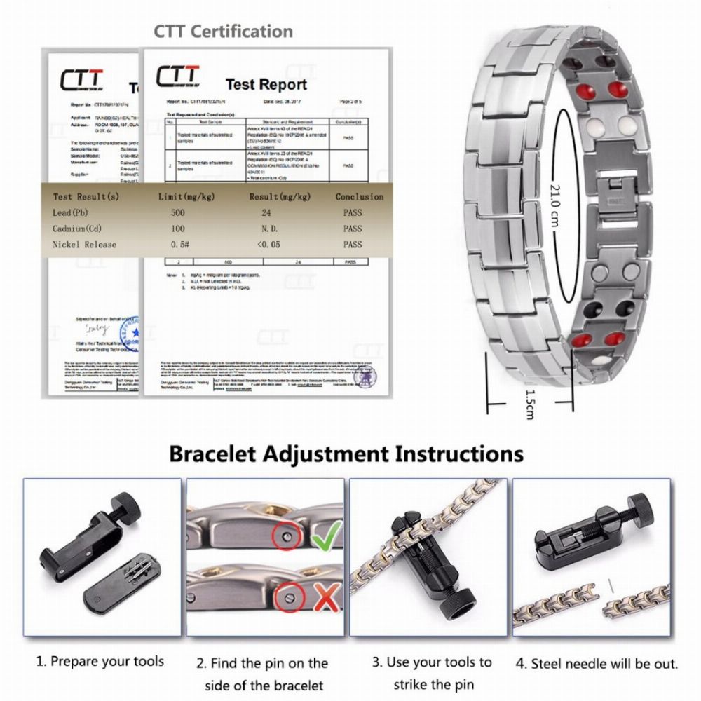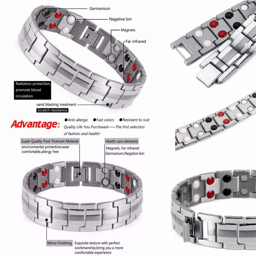 Quality Bio Magnetic Bracelet Feature: 4in 1 Bio magnet health care bracelet Suitable for frequent access to computers, mobile phones and other radiation people Fashion shape style, suitable for any occasion. It is a good gift for your lover, family, friend and coworkers Description: 100% Brand New Color: Silver Main Material:Titanium Steel Length: 21.5cm (215mm) Wide: 1.5cm (15mm) [Conversion: 1cm=0.3937 inch, 1inch=2.54 cm] •21x 3000 gauss rear earth magnets •removable links •High quality Package included: 1* 4in1 Bio Magnets Bracelet (no retail box, safe bubble bag packing) with or without 1* Adjustmant tool Functions of magnets:(Grey color) Reduce blood fat Promote immunity of body Adjust the abnormal bioelectricity and biomagnets. Lower free radicals and postpone senility. Far infrared ray:(Red color) 1.Far infrared emissivity of germanium is 92.1%, its wavelength is 8-10 um, which is the optimal frequency and wavelength people can absorb. The far infrared ray can deeply go into our body absorbing toxic substances and heavy metals, and then decomposes them. It can help the body detoxify and maintain vitality. 2.Far infrared ray has resonance effect on our cells. Due to its thermal effect, it expands blood capillaries, improve blood circulation and relieve fatigue. Germanium(Black colour) -Improve blood circulation and immunity -Relieve fatigue and improve sleep -Alleviate all kinds of nerve pain Reducing stressed blood vessels which can alleviate Migraine Modulate clamminess and wind chill Ease low back pain and pain due to Arthritis Modulate blood pressure, blood fat, blood sugar and some physiological function Assist in the body in curings cancer (broadly) by clearing blockages Detoxification (residual waste and heavy metal in our body) Activate cellular oxidation which supports Anti-aging Negative Ion(White Color) Negative Ions have an invigorating effect on the human body and are created naturally by the energy associated with rolling surf, waterfalls and lightnings. The levels of negative ions present in different environments highlight the deficiency of negative ions in our everyday domestic environment. Standard: Jewelry can produce 800-1000 ions and help your body working. Magnetic Pain Relief Magnetic therapy is the idea that magnets increase circulation, blood flow, and oxygen in a specific area in the body. Increased blood flow can help to relieve pain and stiffness, especially if your joints, back, or muscles are swollen or injured. Many individuals with arthritis and other chronic pain conditions report relief from magnet therapy. Magnetic Mental Therapy Magnet therapy has also been shown to increase relaxation and well-being in some individuals. This may simply reflect the reduction in pain and stiffness, or it may be its own benefit. Many proponents of magnet therapy say that magnetic bracelets restore the body's natural energy field or help align the body's chakras. Either way, relaxation is a very important part of physical health. Consider magnetic therapy to deal with daily stress and tension. The Benefits That Can Be Obtained From Using Magnets: To alleviate pain, increasing mobility in arthritic joints. To ease stress and depression. To promote sound sleep. To aid the recovery of nerve sensation. To aid recovery of torn ligaments, muscle and tendons. To reduce bruising and swelling. To speed recovery in sports injuries. To increase resistance to infection. To improve circulation/body and extremity warming. To assist removal of waste products from the blood, ie. lactic acids, calcium, cholesterol and fat deposits. To increase strength and energy. To speed healing ie. bone fractures. To help recovery or prevent onset of RSI. To alleviate migraine and headaches. To improve overall health. Note: 1.The real color of the item may be slightly different from the pictures shown on website caused by many factors such as brightness of your monitor and light brightness. 2.Please allow slight deviation for the measurement data. 3.Please allow 0.1-0.5cm error due to the hand measurement.