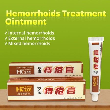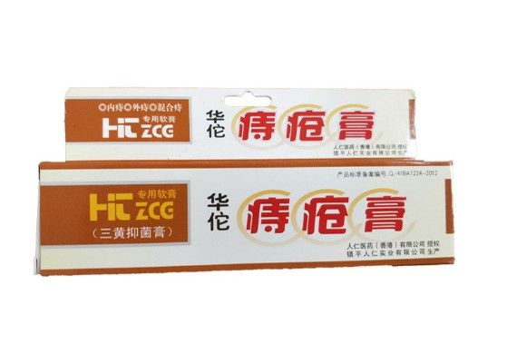 Product series: hemorrhoids ointment Applicable skin: general purpose Shelf life: 24 months. Product name: Hua Tuo hemorrhoids ointment Main Components: Coptis chinensis, Scutellaria baicalensis, Phellodendron chinensis, Sophora japonica, Ulmus pumila, Calamine, Borneol, Glycerin, Stearic Acid, Vaseline, Triethanolamine, Ethyl Nipagin Ester, Purified Water. Inhibition of microorganisms has the effect of inhibiting skin infections caused by bacteria and fungi. Method of use: external application. Rinse the anus with clean water, apply appropriate cream to the hemorrhoids directly, once a day. We suggest that customers buy 3 Tubes 1 Treatment Course. Cautions: Prohibited by pregnant women; sealed preservation. Packaging: 1 Pcs