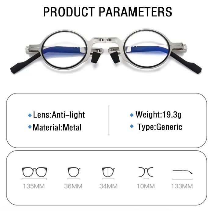 Product name: anti-blue reading glasses Product function: block harmful blue light, protect eyesight health. product details: Use light material, comfortable and healthy. Textured temples, ergonomic design, more suitable curvature Firm hinge, can be opened and closed at will, durable, smooth to use. Comfortable nose pads, smooth and no pressure Retractable and foldable structure, light and small after folding, more convenient to carry. Material: TR (frame) + AC (lens) Color: silver Degrees: +100, +150, +200, +250, +300, +350, +400 Size (approximate): Total width of mirror: 132mm/5.20inch Mirror width: 44mm/1.73inch Mirror height: 36mm/1.41inch Nose spacing: 17mm/0.67inch Temple length: 136mm/5.35inch Package includes: 1*Anti-blue reading glasses