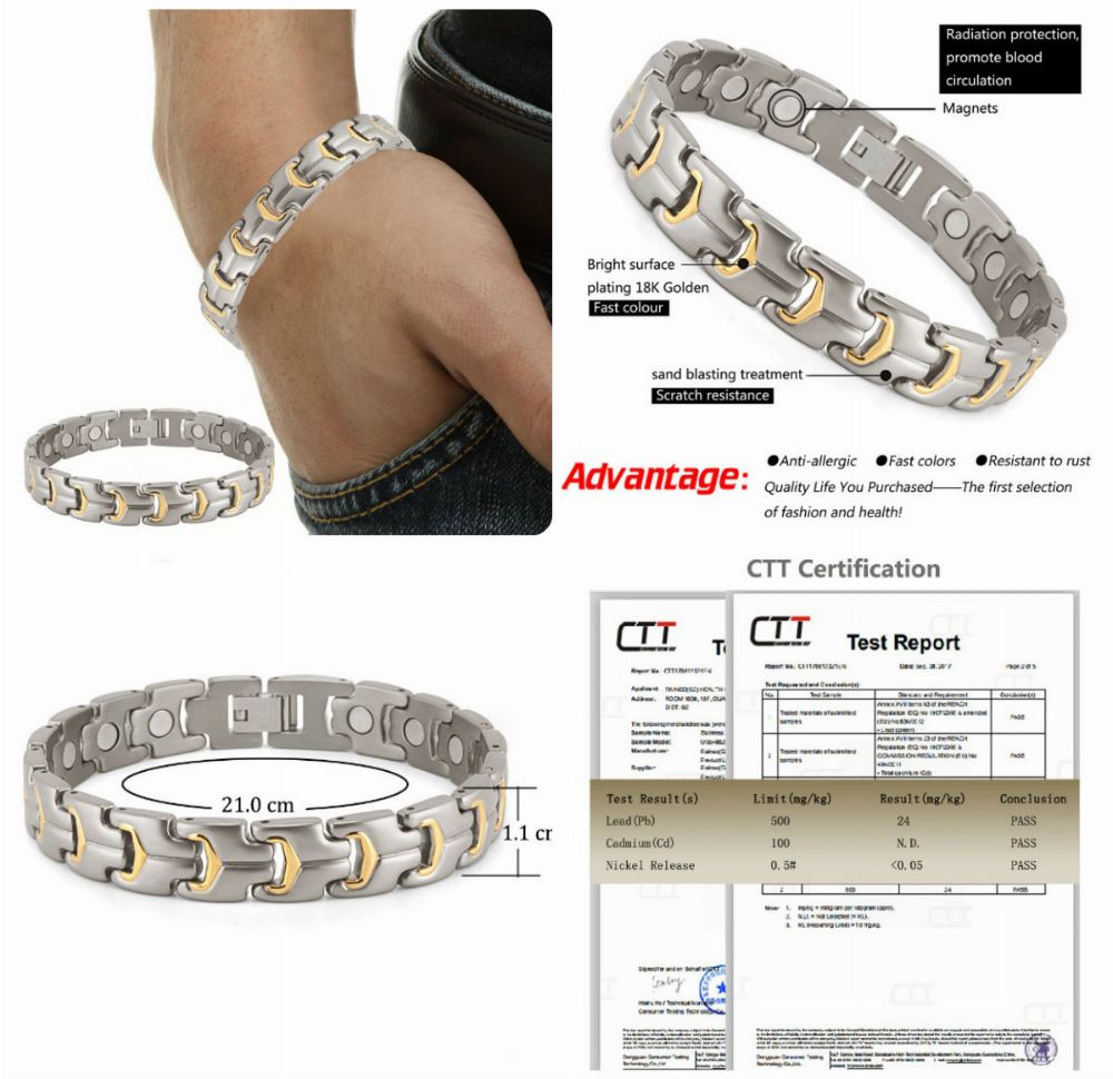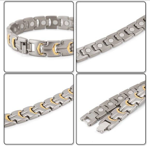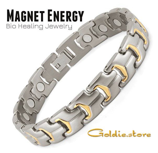 Material stainless steel with Magnets, Magnetic Size/Length 21.0 cm/pc (8.27"/pc) Weigth 35 g/pc Width 11 mm (0.43") Fine or Fashion Fashion Bracelet titanium Color Silver & Gold Magnetic Bracelet Gender Woman,man,Unisex,lovers' Packing Electrostatic film/opp bag Please allow manual measurement error of 0.1-0.3 cm Functions of magnets:(Grey color) Reduce blood fat Promote immunity of body Adjust the abnormal bioelectricity and biomagnets. Lower free radicals and postpone senility. Far infrared ray:(Red color) 1.Far infrared emissivity of germanium is 92.1%, its wavelength is 8-10 um, which is the optimal frequency and wavelength people can absorb. The far infrared ray can deeply go into our body absorbing toxic substances and heavy metals, and then decomposes them. It can help the body detoxify and maintain vitality. 2.Far infrared ray has resonance effect on our cells. Due to its thermal effect, it expands blood capillaries, improve blood circulation and relieve fatigue. Germanium(Black colour) -Improve blood circulation and immunity -Relieve fatigue and improve sleep -Alleviate all kinds of nerve pain Reducing stressed blood vessels which can alleviate Migraine Modulate clamminess and wind chill Ease low back pain and pain due to Arthritis Modulate blood pressure, blood fat, blood sugar and some physiological function Assist in the body in curings cancer (broadly) by clearing blockages Detoxification (residual waste and heavy metal in our body) Activate cellular oxidation which supports Anti-aging Negative Ion(White Color) Negative Ions have an invigorating effect on the human body and are created naturally by the energy associated with rolling surf, waterfalls and lightnings. The levels of negative ions present in different environments highlight the deficiency of negative ions in our everyday domestic environment. Standard: Jewelry can produce 800-1000 ions and help your body working. Magnetic Pain Relief Magnetic therapy is the idea that magnets increase circulation, blood flow, and oxygen in a specific area in the body. Increased blood flow can help to relieve pain and stiffness, especially if your joints, back, or muscles are swollen or injured. Many individuals with arthritis and other chronic pain conditions report relief from magnet therapy. Magnetic Mental Therapy Magnet therapy has also been shown to increase relaxation and well-being in some individuals. This may simply reflect the reduction in pain and stiffness, or it may be its own benefit. Many proponents of magnet therapy say that magnetic bracelets restore the body's natural energy field or help align the body's chakras. Either way, relaxation is a very important part of physical health. Consider magnetic therapy to deal with daily stress and tension. The Benefits That Can Be Obtained From Using Magnets: To alleviate pain, increasing mobility in arthritic joints. To ease stress and depression. To promote sound sleep. To aid the recovery of nerve sensation. To aid recovery of torn ligaments, muscle and tendons. To reduce bruising and swelling. To speed recovery in sports injuries. To increase resistance to infection. To improve circulation/body and extremity warming. To assist removal of waste products from the blood, ie. lactic acids, calcium, cholesterol and fat deposits. To increase strength and energy. To speed healing ie. bone fractures. To help recovery or prevent onset of RSI. To alleviate migraine and headaches. To improve overall health. How to maintenance your bracelet: Wear it every single day, but do not let it touch strong acid, while you swimming or take a shower please take off. Note: 1.The real color of the item may be slightly different from the pictures shown on website caused by many factors such as brightness of your monitor and light brightness. 2.Please allow slight deviation for the measurement data. 3.Please allow 0.1-0.5cm error due to the hand measurement.