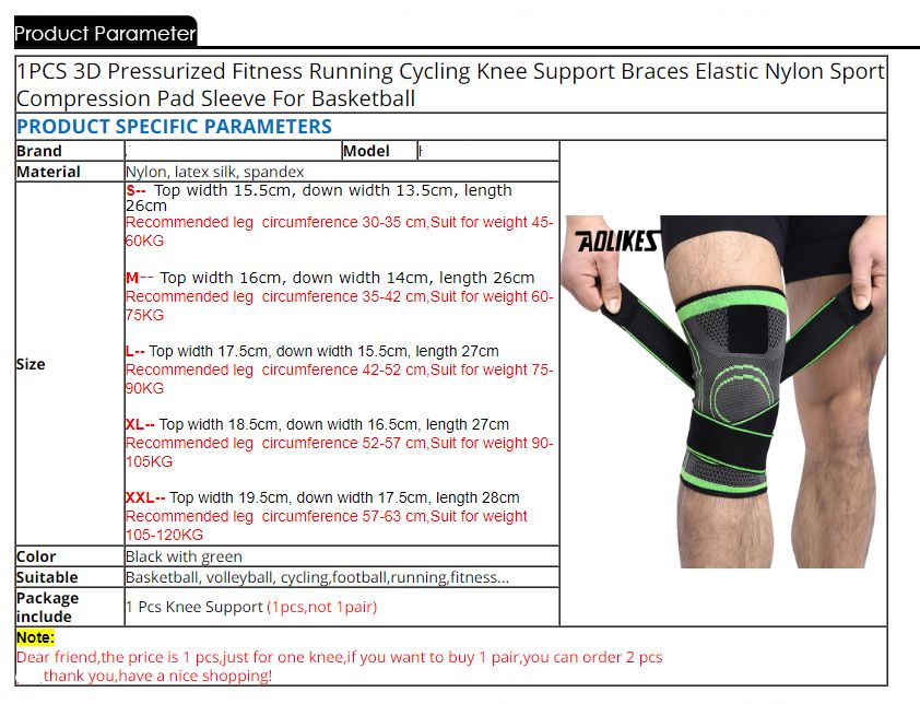 Your knees need to be protected. Studies have shown that only by walking on the ground, our knees will have to bear the weight up to 3-5 times higher than our actual weight. The long walking journey can sometimes be overwhelmed especially to some aged groups or suffering from knee pain. With this unique 3D knee compression pad, it helps to tremendously reduce the pressure strain of your weight on your knee and meniscus for better protection. Product Features: High Quality Grade Material: 68% nylon and 32% spandex. Lightweight, breathable and adjustable comfort fit with 4-way elasticated stretch that will not roll, slide or slip down, enhance circulation & oxygenation of the blood thereby increasing muscle performance & accelerate recovery of injured muscles, joints & much more. Pain Relief & Promotes Muscle/Joint Recovery: Compression is proven to promote muscle recovery and injury prevention, our knee sleeve relieves muscle stiffness, extra soreness and offers rejuvenating relief from arthritis, osteoporosis, tendonitis, pain & discomfort, allowing you to perform at your peak in all situations. Adjustable Unique Bi-directional Support: It is created with 3D weaving technology, high elastic soft fabric, and can be adjusted to fit your knee size with 360 degrees protection to cover your knee. Multi-Purpose Benefits: Our knee brace delivers targeted compression with moderate support for knees.The best knee support sleeve and knee stabilizer for running, athletics, jogging, cycling, weightlifting, squats, soccer, basketball, volleyball, skiing, tennis, golf, walking, hiking, lifting and yoga, just about any sports and exercise activity! Performance guaranteed: Designed to protect knees, promote faster recovery, and improve muscular endurance. Our goal is to ensure our knee pain relief products support you on your fitness journey, keeping you on your feet for longer. Features: Three-dimensional weaving technology, high flexibility, good ventilation, wearing a more comfortable fit. Pressure belt design, adjustable, more fit parts. Prevention or rehabilitation after injury, all kinds of fitness exercise. Full range of flexibility provides a more fit and more comfortable support on the knee. Suitable for a variety of fitness exercises. Descriptions: Keeps the knee warm and appropriate, to relieve the pain of chronic arthritis. High elasticity provides a more fit and more comfortable support for the knee. Keep your knees warm and relieve the pain of chronic arthritis. Specifications: Material: nylon Size on picture Color: green, black, orange Package included: 1 x Knee Support Brace Notes: 1.Due to the difference between different monitors,the picture may not reflect the actual color of the item. We guarantee the style is the same as shown in the pictures. 2.Due to the manual measurement and different measurement methods, please allow 1-3cm deviation.Thanks!