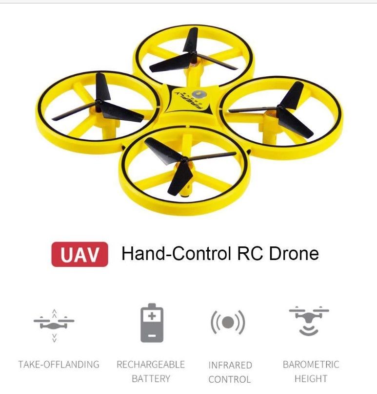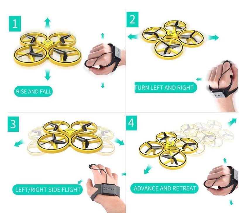 Feature: 1.WATCH SENSING CONTROL -- Different from other RC drones on the market, our drones are equipped with a watch induction control assembly, which can control the up and down movement of the drone directly through the watch sensing device, turn left and turn right, move forward and backward, fly left and right. 2.EASY TO OPERATE -- If you don't want to use the smart watch, you can push the drone to fly by hand, open the switch, throw the drone to the air, it will perform flight sensing. 3.INFRARED OBSTACLE AVOIDANCE -- Infrared automatically avoids obstacles, ensuring that the drone will not hit the obstacle during the play, push the yellow water droplet remote control to let it land slowly. 4.HIGH QUALITY -- Made of environmentally friendly non-toxic ABS material, safe enough to your kids as well as the environment, have a good time without trepidation. Sturdy material, LED lighting effect. Specification: Product Size:17x17x4.5 cm Color: Yellow Product Battery: 3.7V 400mAh Li-poly battery Battery for remote: Button batteries (not included) Work time: 5-7 minutes Remote distance: 40 meters Content included: 1 * RC Drone 1 * Remote Controller 1 * Watch Controller 2 * USB charger 1 * 3.7V 400mAh Lipo Battery 1 * User Manual