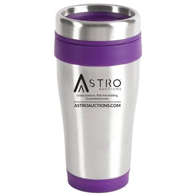 Keep your coffee or tea hot while you blast off on your next auction with the Astro Auction Travel Tumbler! This classic 16 oz.(473 mL) double wall insulated tumbler features a durable stainless steel exterior and BPA-Free plastic interior. The purple accent color band with matching color thumb slide plastic lid looks great with the Astro Auctions name, site address, and description summary: "Great products. Risk-free bidding. Guaranteed prizes." on the front. The Astro Auction Travel Tumbler fits most automobile cup holders. Makes a great gift!