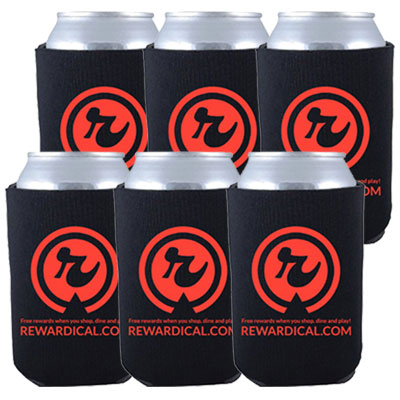 Keep your cool and spread the word about the Rewardicals free rewards program with this awesome 6 pack of Rewardical.com Foam Can Coolers! These koozies are made from premium 1/8-inch thick open-cell foam, fit standard-sized beverage cans and have an eye-catching Rewardical logo, the Rewardical.com URL, and the Rewardical tagline "Free rewards when you shop, dine, and play!" in red against a black background.