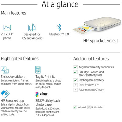 Make the moment yours with the HP Sprocket Select Portable Photo Printer. Producing glossy 2.3 x3.4-inch sticky-based photos, this cool accessory features a rechargeable battery and Zero Ink technology. Measuring just 3.48 x 5.13 x 0.69 inches, it also fits easily in your bag, pocket, or jacket for instant, on-the-go pictures and sharable memories no matter where you are! You can also use the free HP Sprocket app on your smartphone for access to exclusive designer features for your pictures. Customize your photos with doodles before printing; unlock content in augmented reality; and search by hashtag to seamlessly filter and print social media photos from your smartphone. Ideal for photo journals, creative projects, and scrapbook enthusiasts. PRODUCT FEATURES: * Print 30% larger photos in an instant – connect with the HP Sprocket app using Bluetooth, and quickly print photos 30% larger than those of the original HP sprocket. * Exclusive fashionable photo Features – curate your photos with the HP Sprocket app, and access exclusive designer features, frames, filters, and stickers for your pictures. * Personalize your prints – Take a picture of your own doodles and turn them into custom stickers, using the free HP sprocket app. * Tag-to-print – easily find and Print social media photos from your smartphone—hashtag a photo in social media and use the HP Sprocket app to seamlessly filter for printing. * Slim, portable design – This thin, portable photo printer is designed to match your style and go virtually anywhere. * Augmented reality fun – use the HP Sprocket app to unlock content in Augmented reality and view shared Print queues, hidden videos, and more. * Includes HP ZINK photo paper – load the 10 sheets of HP ZINK 2.3 x3.4-inch sticky-backed paper into your portable picture printer and create smudge-proof photos and stickers for your creative projects.