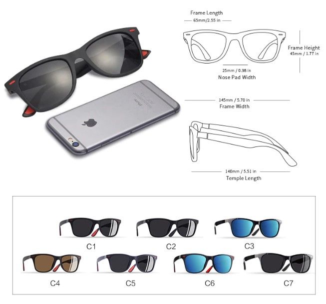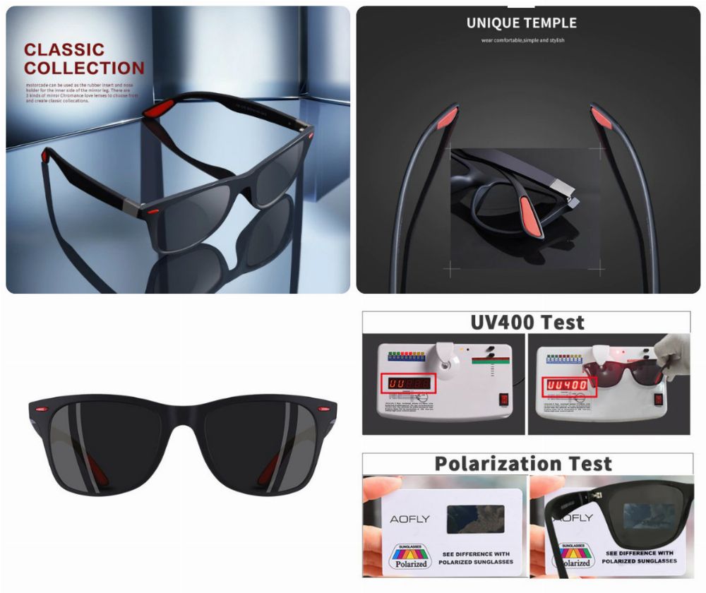 Eyewear Type: Sunglasses Item Type: Eyewear Lenses Optical Attribute: UV400 Lenses Optical Attribute: Mirror Lenses Optical Attribute: Anti-Reflective Lenses Optical Attribute: Polarized Model Number: AF8083 Lens Height: 43mm Style: Square Frame Material: Plastic Gender: Men Lenses Material: TAC Lens Width: 63mm Brand Name: AOFLY Department Name: Adult Frame Material: Ultra-light TR90 frame Lens Material: 1.1 Thickness TAC Polarized