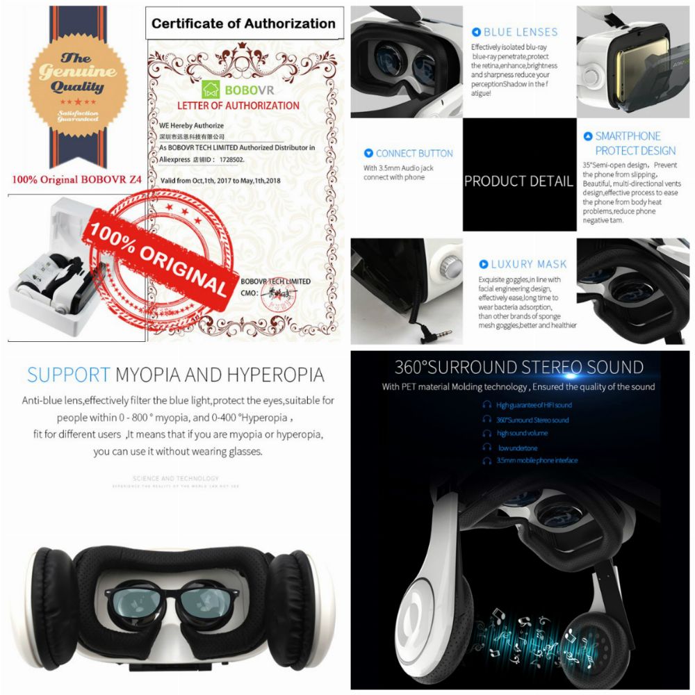 120 degrees large field of view, adopts Japanese imported PMMA lens, with 35mm focus showing a real view Immersive sound and 3D vision are integrated, provides an excellent experience 40mm diaphragm adopts PET material, more powerful sound Support one key answering phone calls and volume controlling Suitable for people within 0 - 800 degrees myopia, and 0 - 400 degree hyperopia Adjustable pupil fit for different users Very good in heat dissipation Lightweight design for long time comfort, reduces eye fatigue Adjustable headband adds no burden to your head Built-in stretchable earphones, with soft memory foam for noise canceling Specifications: Model: BOBOVR Z4 VR Glasses Type: VR Glasses Compatible with: Smartphones Material: ABS, Foam, PC Color: White Smartphone Compatibility: 4.0 - 6.0 inch Package Include: 1 X Z4 3D VR Virtual Reality Glasses 1* User Manual FAQ 1.If this bobovr original ? We promise all of our product in our sotre is original and brand new! 2.What's bobovr z4 3d glasses ? 3D glasses is a kind of device help us enjoy 3D movie / game with our phone . bobovr is one of the best brand in china , the lenses and the structure is very good! 3.What kind of phone works with item ? Works for all 4'-6' smartphone ,Width less than 82mm, length less than 160mm, thickness no more than 10mm . 4.How to use ? Download the vr app (if you can't find vr app , please contact us ) to your phone , open the 3d video , then put your phone into the vr box , adjust the lenses , you can enjoy the 3D movie . 5.What's the FOV of BOBOVR Z4 ? 120 degrees FOV large field of view, adopts Japanese imported PMMA lens, with 35mm focus showing a real view , make you enjoy your private cinema . 6.It's headphone is stereo ? Yes, Powerful & Stereo sound ! The Built-in stretchable 3.5mm jack earphones, with soft memory foam for noise canceling. Immersive sound and 3D vision are integrated, provides an excellent experience 40mm diaphragm adopts PET material . 7.What's the button on the bottom use for ? The button in the bottom supports one key answering phone calls and volume controlling and supports next song operation . 8.Does it supports myopia ? Yes , Suitable for people within 0 - 800 degrees myopia, and 0 - 400 degree hyperopia Adjustable pupil fit for different users , it means that if you are myopia or hyperopia , you can use it without wearing glasses . 9.The remote controller can play games ? The remote controller can play the normal android games and a few vr games , because most of vr game will use the Gyro of your phone to play . about the ios system , it is a closed system , any gamepad can not control the ios completely , we just can play/stop/vol+/vol- on ios system .