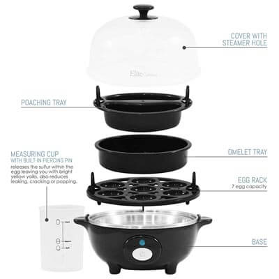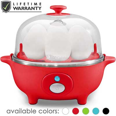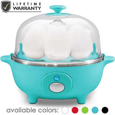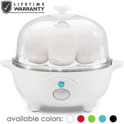 Say goodbye to undercooked or overcooked eggs! The Automatic Easy Egg Cooker cooks your eggs to perfection every time. Use the included measuring cup to calibrate the water level and use the piercing pin to pierce the eggs prior to cooking for a consistently perfect golden yellow yolk. A convenient automatic shut-off indicator light lets you know exactly when the cooking cycle is complete, and a built-in timer adjusts automatically to cook up to 7 eggs at a time exactly to your liking—soft, medium, or hard boiled firmness with easy-to-peel shells. In addition, an included poaching tray lets you gently poach two eggs at a time, while an omelet tray lets you create delicious omelets to suit any taste.