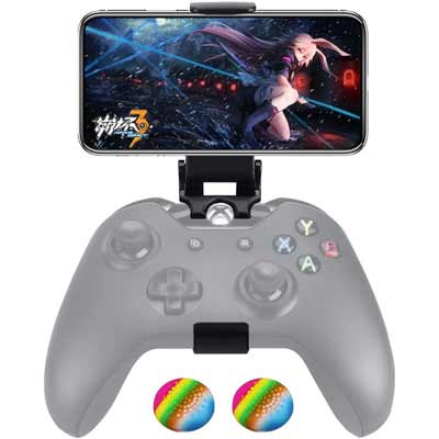 Quickly boost your smartphone gaming to a higher, funner level with this Customized Controller Foldable Mobile Phone Cli. Featuring a perfect fit for Microsoft Xbox One/Xbox One S/Xbox One X, and Steel series Nimbus Wireless Controllers, the clip easily connects your controller and smartphone without any tools needed. The clip's telescopic design supports mobile phones with widths up to 3.5 inches and a 160-degree adjustable viewing angle. Small and foldable, this clip fits nicely in your pocket, bag, or suitcase for a better gaming experience wherever you go. Includes two free rainbow thumb grips. NOTE: Xbox wireless controller and mobile phone are not included.