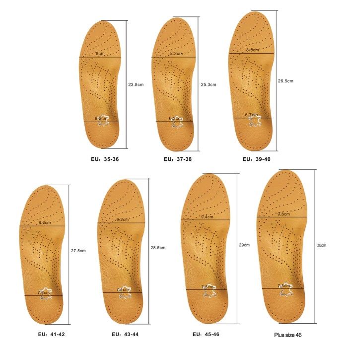 Details: Size: EU(35-36/ 37-38/ 39-40/ 41-42/ 43-44/ 45-46) Length: 23.5/ 25.5/ 26.5/ 27.5/ 28.5/ 29(cm) Perforated leather provides air circulation so that feet can breathe Effectively in correct the heel varus, O/X leg and within eight Product description: >>>Specially designed for low Arch and flat foot. >>>Helps control, stabilize and balance the foot . >>>Reduces friction to improve overall foot comfort. >>>Relieves Heel and Arch pain . >>>Top cover absorbs sweat and washable. >> > Convenient, soft and comfortable The excellent footbed. For cool and relaxed walking 2.5cm arch support Reduces heel,ankle and back pain PUC arch support,latex foot massage. Ideal for sockless feet Insole material:PU+leather+Latex+PUC Because of the fragility of the latex, each layer with glue adhesion, please don't tear easily. Otherwise it is easy to break. Note: Due to the difference between different monitors, the picture may not reflect the actual color of the item. We guarantee the style is the same as shown in the pictures, but not the same performance on different bodies as on the model. Thank you! Package includes: 1 x 1 pairs insoles