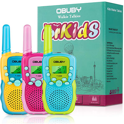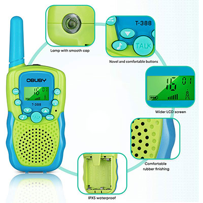 Designed for small hands and young minds, the lightweight Obuby Walkie Talkies/b> feature simple instructions and clear, easy-push buttons. An LCD Backlight Display shows channels, volume, button lock, battery status and more. And the built-in flashlight is perfect for summer nighttime play, emergencies, and other low-light or after-dark tasks.