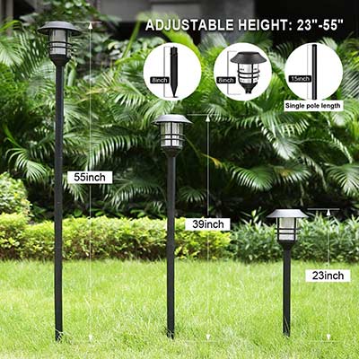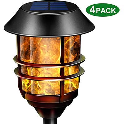 Enjoy the welcoming atmosphere of flickering flames without the mess, danger, or cost with this 4 pack of Zoohar 55-inch Tall Solar Torches. Made from waterproof stainless steel, these lights feature a sleek, rust resistant black finish that withstands all kinds of weather. Perfect for patios, walkways, driveways, steps, decks, party lighting, and more, the outdoor solar torches create beautiful dancing light, giving the appearance of real flame. Three adjustable heights (23", 39", and 55") suit a variety of situations, landscaping, and needs.