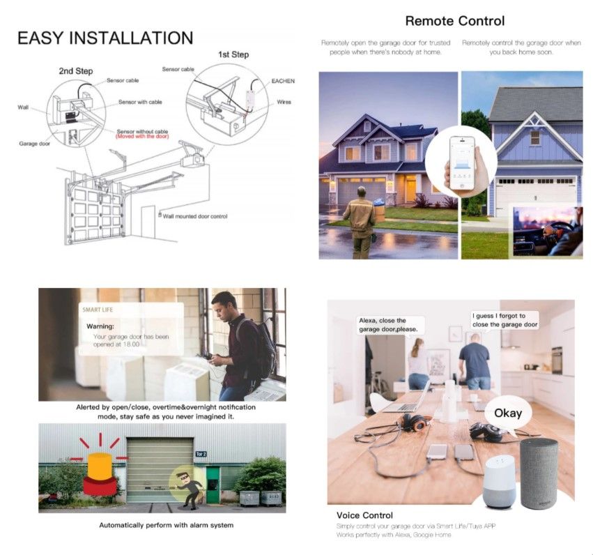 Product Features: 1.UPGRADE YOUR GARAGE DOOR TO SMART CONTROL by adding this module to your current opener. Integrated with your Wi-Fi System, you can now Operate, Monitor, and Automate your Door with your Smart Phone and Alexa / Google Home Assistants. 2.THE VERSATILE SMART LIFE ANDROID / iOS APP provides features such as Door Position Status via an Animated Garage Door, Alerts thru your Smart Phone, History of Open/Close Times, and both Countdown & Repeat Timers,NO MONTHLY SUBSCRIPTION FEES. 3.USER FRIENDLY FOR YOUR ENTIRE FAMILY – Multiple User Access provides Both Security Convenience Expecting a Package Delivery,Remotely Open the Garage Door for the Driver when he Arrives and then Close It. Add A Remote Camera in you garage for added Security to monitor the delivery. 4.GIVE YOUR GARAGE OPENER THE ULTIMATE SMART MAKEOVER:Connects Simply to Most Garage Door Opener Models Using Our Easy to Follow Instructions.Compatible with most garage door openers,please check your garage door opener's model in sixth picture. 100% Brand New and High Quality! Remotely open the garage door for trusted people when there's nobody at home. Remotely control the gorage door when you back home soon. Alerted by open/close, overtime& overnight notification mode, stay safe as you never imagined it. Automatically perform with alarm system. Simply control your garage door via Smart Life/Tuya APP Works perfectly with Alexa,Google Home. Device Sharing: You can share it to your family and friends or visitors, OF COURSE, you can take back the permissions at any time. History Record: You can check the garage door opening or closing history records on your APP to ensure the safety of your garage. Specification: Plug model:UK/US/EU Shell material: ABS Rated voltage: 90-240v Rated current: 10a 3C rated voltage range: 440V and below Package Included: 1*WiFi switch 3*gum 4*Line Holder 4*tie Wall Nails Screws 1*instruction