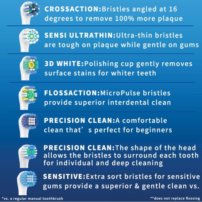 Advantage: 1) Soft Dupont Nylon bristle, can provide better cleaning and oral care. 2) Rounded end bristle, protect teeth from too-firm brushing. 3) Waterproof package. 4) Smart and comfortable for using. 5) Safe and gentle on teeth and gums. 6) A complete clean for white teeth and healthier gums. 7) Remove up to twice as much plaque as an ordinary manual toothbrush. 8) Come with dentist recommended oscillate and rotate technology for maximum cleaning. Specification: CROSSACTION (YE-50A): Multi-angle clean type 4 sticks SENSI ULTRATHIN (YE-60A): 4 sticks of gum care type 3D WHITE (YE-18A): 4 sticks of whitening and cleaning type FLOSSACTION (YE-25A): 4 sticks of dental floss effect PRECISION CLEAN COMFORTABLE (YE-20A): Precise cleaning type 4 sticks PRECISION CLEAN SURROUNDING (YE-17A): Professional cleaning type 4 sticks SENSITIVE (YE-17S): Sensitive cleaning type 4 sticks *See the photo above for an additional description. How to use: Just simply replace brush head as usual.