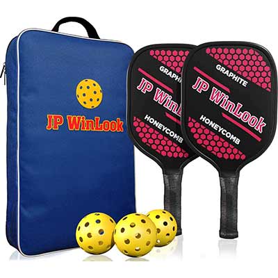 The JP WinLook Pickleball Paddles Set fun for the whole family! Lightweight and durable, the JP racquets feature a honeycomb core for a balanced feel, maximum control, and powerful hitting, as well as super soft, ultra-cushion non-slippery handles with elite wraps (overgrip) for a comfortable grip and precise maneuverability. Shots are more accurate, and the resilient graphite surface offers great ball spin. A slim edge guard helps protect the paddle head against ground hits. And with precisely drilled holes, the three high visibility, orange-yellow JP WinLook pickle balls deliver the perfect bounce and flight paths to facilitate aggressive hits and minimized wind interference. Great for beginner recreational or professional indoor and outdoor play. Includes a convenient carrying duffle for easy transport and protection.