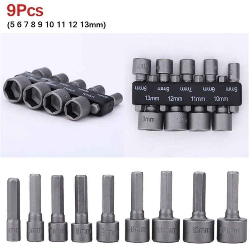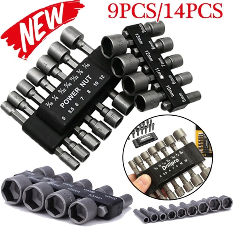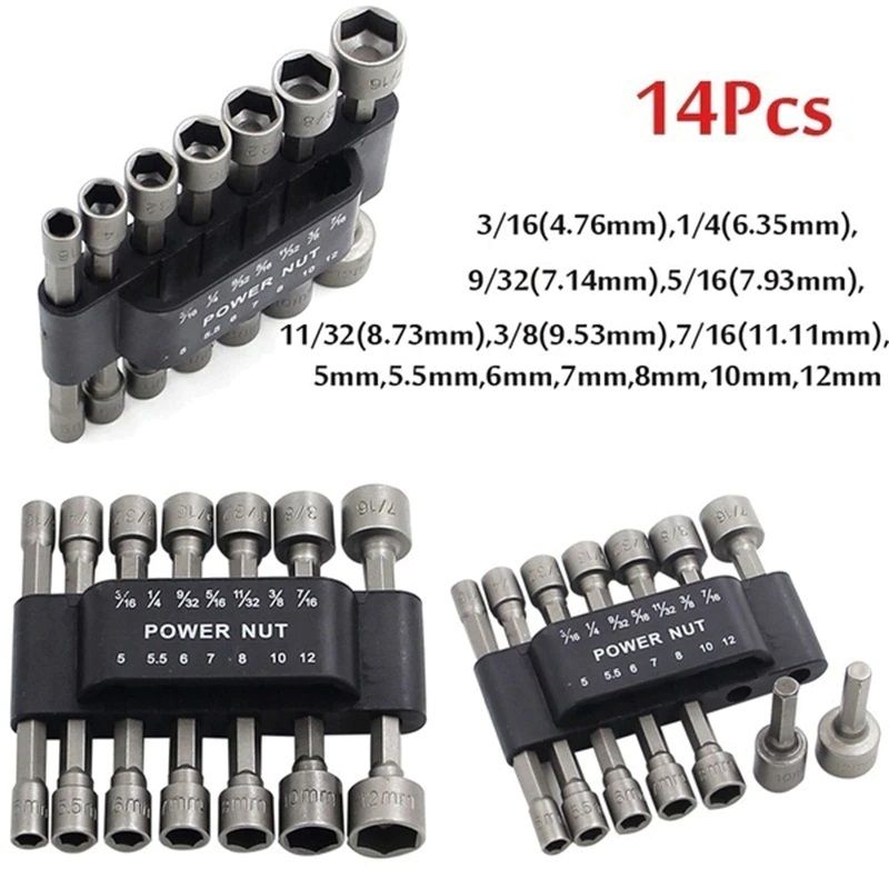 9/14pcs/set 5mm-13mm Screwdriver Set Hex Socket Sleeve Nozzles Nut Driver Set Drill Bit Adapter Socket Bit Hand Tools 9Pcs Specification: Material: CRV Product size: 5 6 7 8 9 10 11 12 13mm/0.19 0.23 0.27 0.31 0.35 0.39 0.43 0.47 0.51 inch Weight: approx. 140g Shank diameter: across flats 6.35mm/0.25inch hex shank Usage: Screwdrivers nut driver socket bits 14Pcs Specifications: Material: Tool Steel 40CR Specification: 3/16(4.76mm),1/4(6.35mm),9/32(7.14mm),5/16(7.93mm),11/32(8.73mm),3/8(9.53mm),7/16(11.11mm) 5mm,5.5mm,6mm,7mm,8mm,10mm,12mm Packaging: rubber suit Product sizes: total length is 38mm/1.5", handle length is 20mm/0.79", handle diameter is 6.3mm/0.25" Weight: 210g Notes: Due to the different monitor and light effect, the actual color of the item might be slightly different from the color showed on the pictures. Thank you! Please allow 1-3mm measuring deviation due to manual measurement. Included: 9/14pcs X Sleeve Wrenches