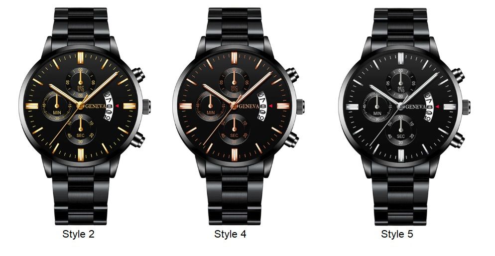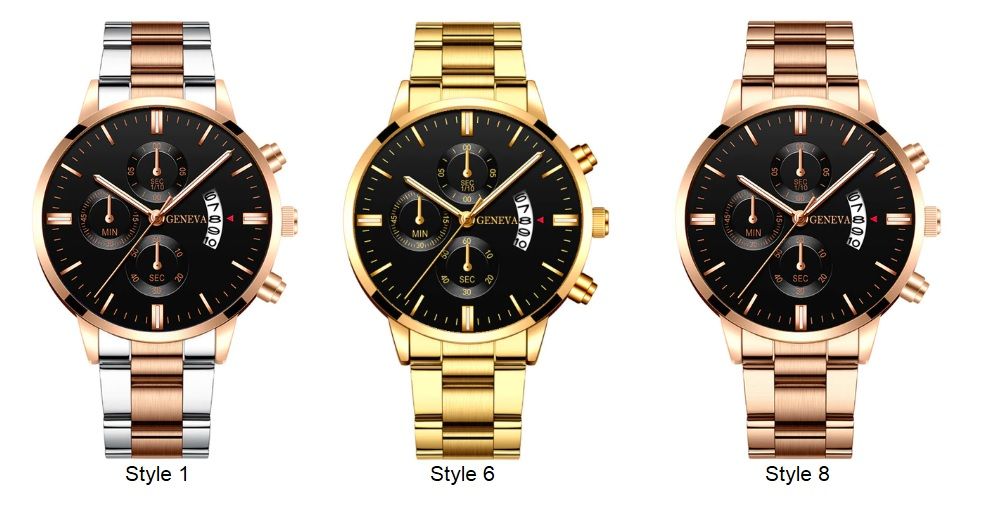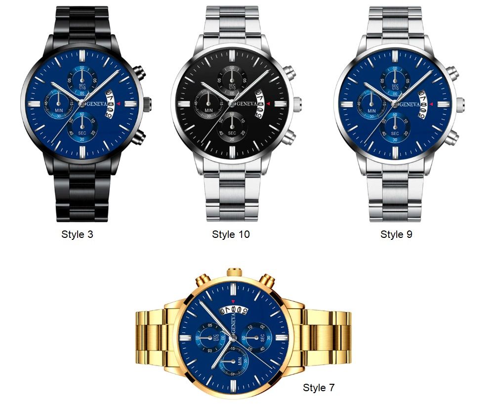 GENEVA stylish quarts watch Watches categories:Men,male Watch style:fashion top brand luxury sport Dial Shape of the dial:Round Movement type:Quartz Display type:Pointer Dail color:black or blue Band Band materal:Stainless steel Clasp type:Pin buckle Band color:Black,silver gold and rose gold Size and weight band lenght: 24 cm Dial diameter: 4.3 cm Dial thickness:1 cm Band width: 2,2 cm Watch weight:50 g Water Resistance Depth: No waterproof Package 1X watch Please note: the small dial is just a decorative effect and does not work.
