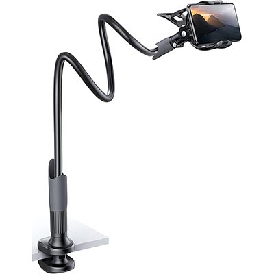 Watch videos, FaceTime with friends, read recipes while preparing meals, take selfies, and more all hands-free with the Lamicall Gooseneck Multipurpose Phone Holder. Featuring an adjustable, non-slip silicone clamp base, the Lamicall phone holder can be securely mounted on a bed frame, bedside, headboard, nightstand, desk, end table, or kitchen counter without scratching or damaging the surface. The 33.4-inch (85cm) bendable gooseneck arm is made from a sturdy, aluminum-magnesium alloy strong enough to hold your phone firmly while letting you adjust it in any direction to accommodate your view.