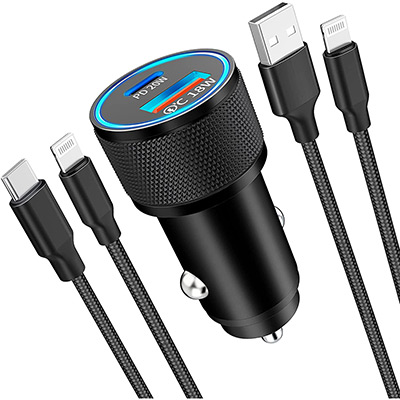 Equipped with a 20W power delivery USB C Charger and an 18W quick charge charger, the Veetone iPhone Fast Car Charger can charge two devices simultaneously and up to 4X FASTER compared with 5V/1A chargers! An iPhone 13 charges to 60% in less than 30 minutes, for example, nearly 2 hours faster that with other, slower chargers. The Veetone uses a durable nylon braided cable and a built-in MFi Certified C94 Smart Chip for overvoltage protection, battery protection, and automatic chip recognition to help protect your Apple devices from damages. Compatible with nearly all Apple devices, the charger auto-detects your device and identifies the appropriate current to charge optimally at its fully intended speed. A ring indicator LED light makes finding the charging ports easy at night. Veetone iPhone Fast Car Charger Compatible Devices: IPhone 13, iPhone 13 Mini, iPhone 13 Pro, iPhone 13 Pro Max, iPhone 12, iPhone 12 Mini, iPhone 12 Pro, iPhone 12 Pro Max, iPhone SE 2020, iPhone 11, iPhone 11 Pro, iPhone 11 Pro Max, iPhone X, iPhone XR, iPhone XS, iPhone XS Max, iPhone 8, iPhone 8 Plus, iPhone 7, iPhone 7 Plus, iPhone 6s, iPhone 6s Plus, iPhone 6, iPhone 6 Plus, iPhone 5S, iPhone SE, iPhone 5, iPhone 5C, iPad Air, iPad mini, iPad Pro, iPod, Airpods 3/2/1, Airpods Pro