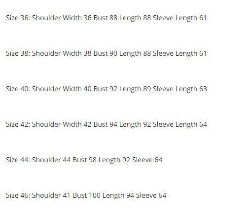 Size 42: Shoulder Width 42 Bust 94 Length 92 Sleeve Length 64