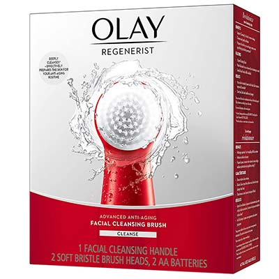 Elevate your daily skin care cleansing routine with the dermatologist-designed Facial Cleansing/Exfoliating Brush by Olay Regeneris. This 2-speed facial brush boosts the power of your cleanser for a deeper clean delivering superior cleansing on hard-to-remove makeup. Just dampen your face, apply your favorite cleanser, moisten the brush head, and gently exfoliate your face for 60 seconds to remove those dulling surface cells. Rinse for soft, refreshed skin, and your face will be primed to maximize the hydrating effectiveness of your moisturizer and better absorb anti-aging ingredients. Safe to use in the shower. Includes 1 facial cleansing device handle, 2 soft bristle brush heads, and 2 AA batteries. Makes a great gift or stocking stuffer!