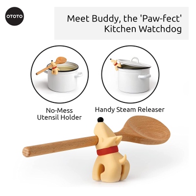 Meet Buddy, the 'Paw-fect' Kitchen Spoon Rest! When your pot's boiliing over or you need a free hand, the OTOTO Buddy Spoon Rest is here as your loyal watchdog on command! This adorable doggo helps make cooking less of a hassle. Simply place him on a bubbling pot to keep your utensil handy. Buddy doesn't slide or slip and he can also function as a steam releaser. Made of food grade, heat-resistant silicone, this spoon rest also works great on kitchen counters, on stove tops, or in the dining area for more convenient serving and meal prepping. When you're done, simply toss Buddy into the dishwasher for quick and easy cleaning. A cute, quirky gift for foodies, home cooks, master chefs, and anyone who loves an adorable surprise.