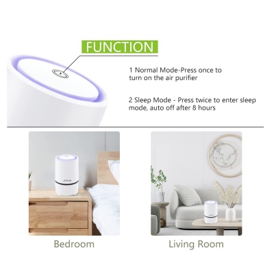 Breathe easier with the JINPUS Portable Air Purifier w/HEPA Filter! The clean, portable design fits seamlessly in with any decor and is perfect for small homes, individual apartments, offices, bedrooms, and more. A whisper quiet sleep mode won't disturb you while you sleep. A replaceable HEPA filter traps 99.97% of smoke, pollen, odor, and dust as small as 0.3 microns in areas up to 80 square feet. PRODUCT SPECIFICATIONS: Product size: 4.92 * 7.64 in /125 * 194mm Product weight: 0.55 kg Voltage: DC 5V Working power: ≤ 2.5W Noise level: ≤30 dB Cleaning Efficiency (CADR): 51-150 m³ / h USB cable length: 4.9 ft/ 1.5 m Purification efficiency (CARD)51-150m³ / h and effective range 15 m² (161 ft²) In the box: • Air Purifier • USB cable, 4.9 feet (plug adapter not included) • Manual