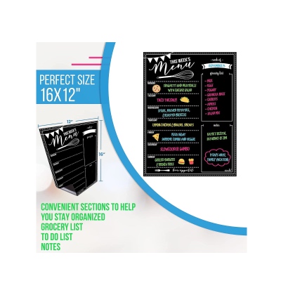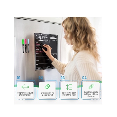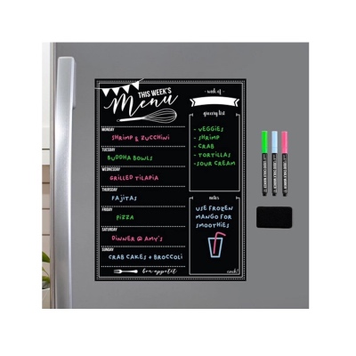 Level up from those boring generic boards with cheap markers and writing you can barely see with the Cinch! Magnetic Dry Erase Menu Board. Featuring a super cute design with amazingly bright neon liquid chalk markers that erase effortlessly with a paper towel this attention-getting board has dedicated spaces for each day of the week that helps you lay out your family's meals and to-do list in detail. There are also areas for grocery lists and notes or reminders. Measures 16 x 12 inches.