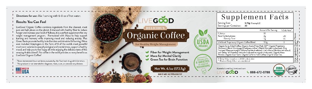 Healthy Organic Weight Management Coffee with Mushrooms Yes, this is very likely the longest name for a coffee you’ve ever seen. But the truth is, with all of the amazing benefits and ingredients we’ve packed into this blend, we could have added even more words, like adaptogens, green tea, healthy fiber, maca, and especially delicious! Not only does LiveGood Organic coffee combine the highest quality ingredients from the cleanest, most pure and lush places on the planet, it is the FIRST and ONLY coffee enhanced with healthy fiber to reduce hunger, formulated with maca to help support learning and memory while improving mood, plus green tea to promote healthy brain function and stimulate fat burning, AND adaptogens in the form of 6 of the world’s most powerful mushrooms to ease stress, support a healthy body, and help you feel great! No coffee on the planet provides as many benefits as LiveGood Healthy Organic Weight Management Coffee with Mushrooms 😊 From the first time you taste our delicious blend, and experience the amazing results, you may never want to drink another coffee ever again! Just mix one scoop of our delicious ground instant coffee in a cup of hot water and stir.